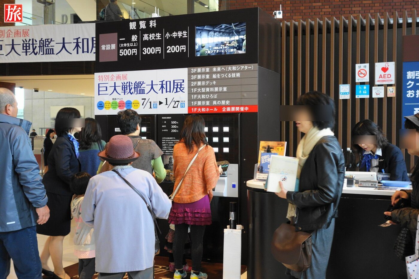 大和ミュージアム入場受付です。入場料金は大人1人500円です。ミュージアムショップの様子です。1/10戦艦大和の案内板。