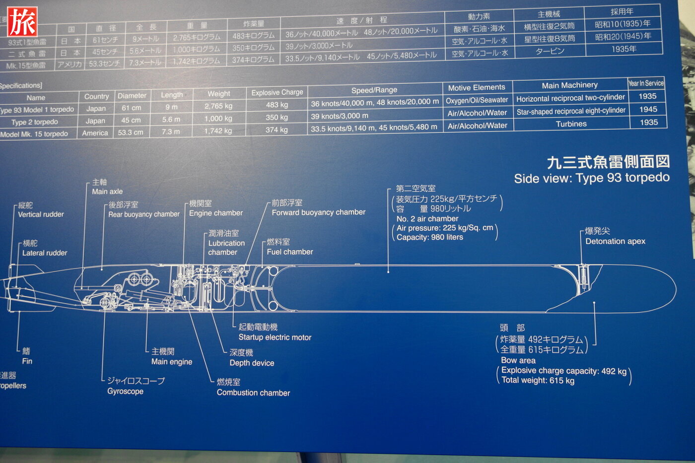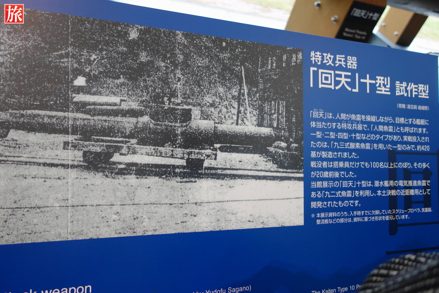 九三式魚雷です。九三式魚雷の説明板。特攻兵器「回天」十型(試作型)の説明板。