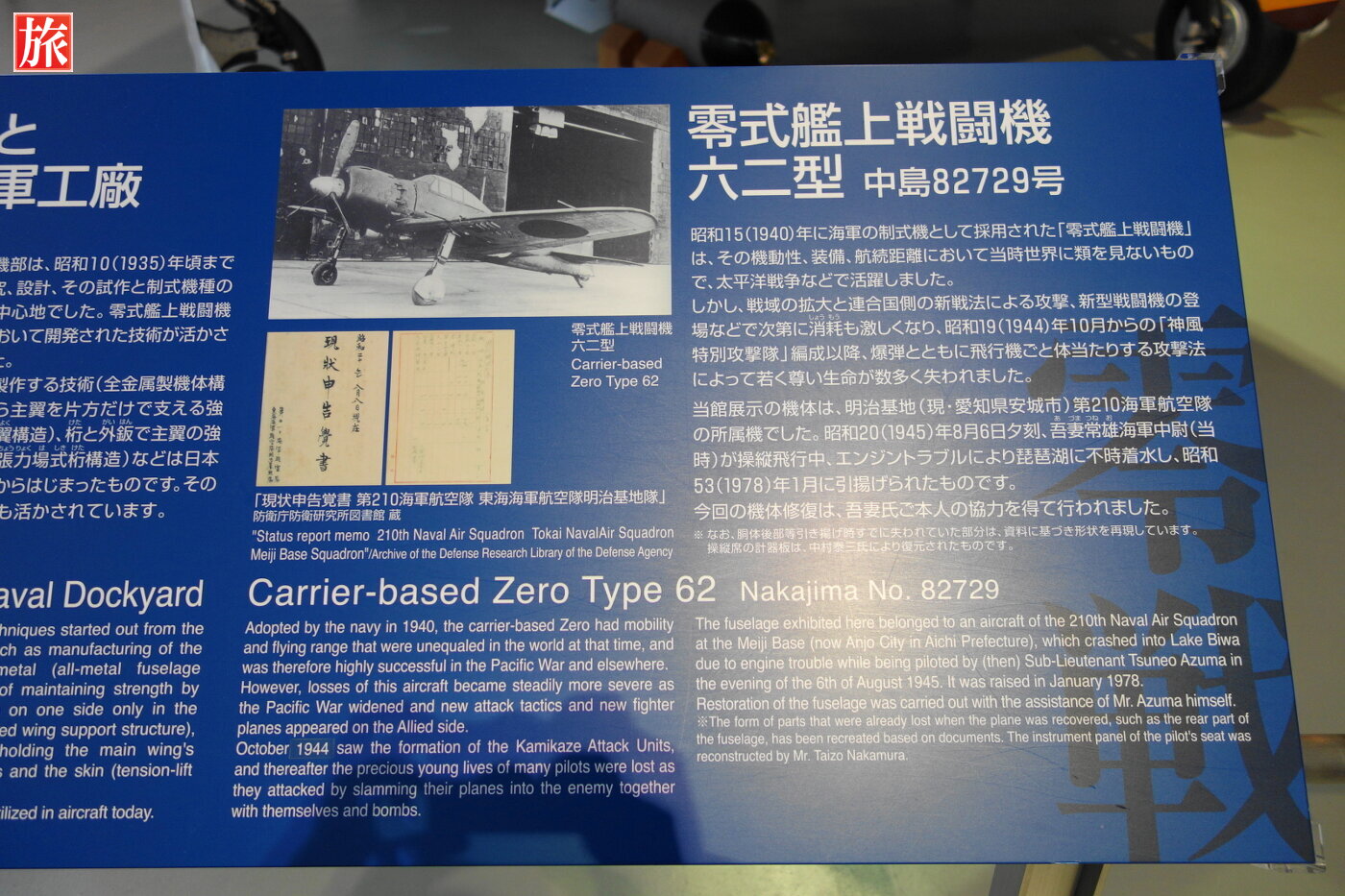 大型資料展示室の零戦六二型です。零式艦上戦闘機六二型の説明板。琵琶湖で発見された不時着水没機を復元させたようです。