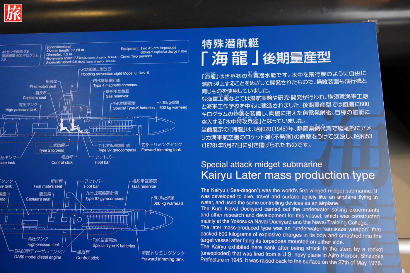 特殊潜航艇「海龍」(後期量産型)。全長:17.28メートル、水中速力9.8ノット、乗員2名です。海龍の説明板。生産後期では先頭部に600kgの爆薬を備え、両脇に抱えた2本の魚雷を発射した後、目標に突っ込む特攻兵器となりました。
