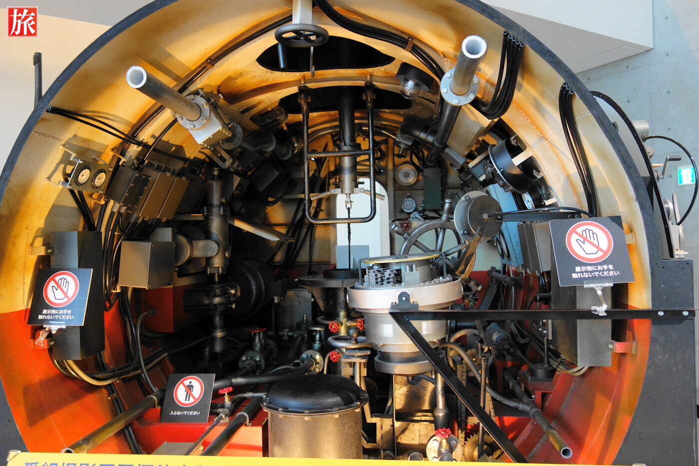 番組撮影用甲標的内部セット。甲標的は、大日本帝国海軍が初めて開発した特殊潜航艇で基地や母艦から発進して、敵艦船を魚雷で攻撃する潜航艇。セットは甲標的甲型の操縦室を再現したものです。番組撮影用甲標的内部セットの説明板。