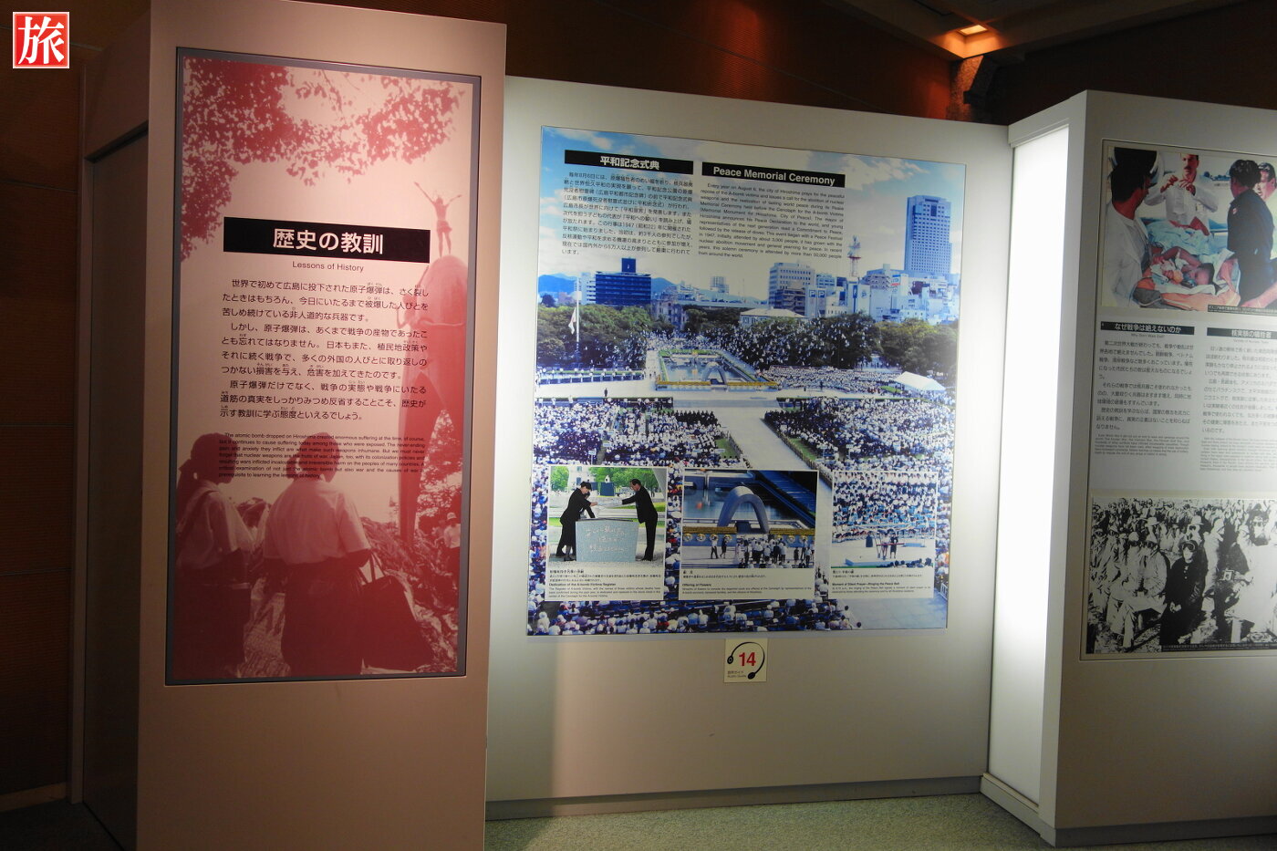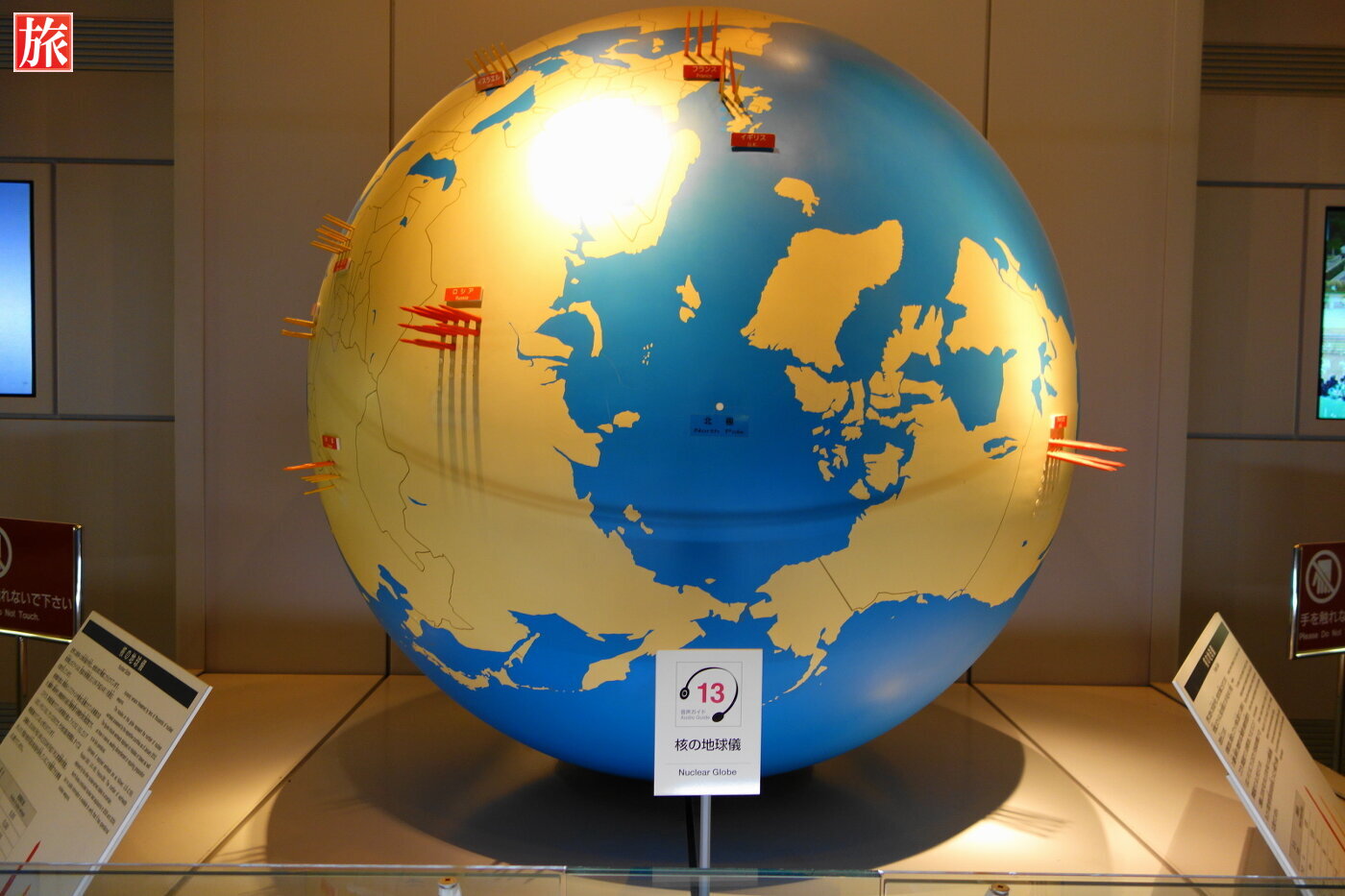 核保有国の説明板。核兵器マークが付いている核の地球儀。平和記念式典のパネル。通路には、広島の歴史などの説明したパネル多数ありました。