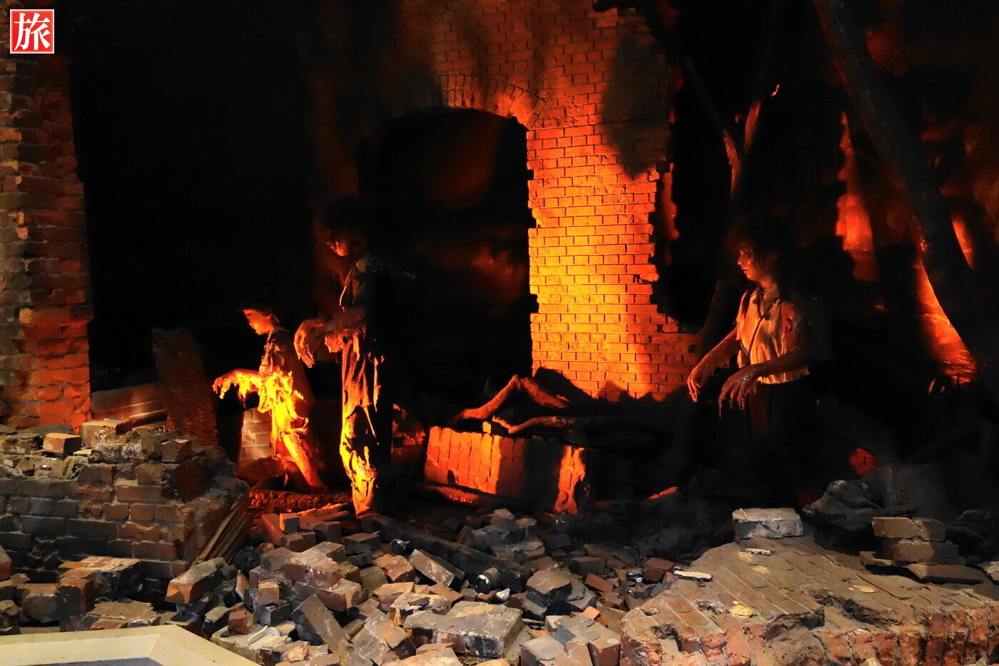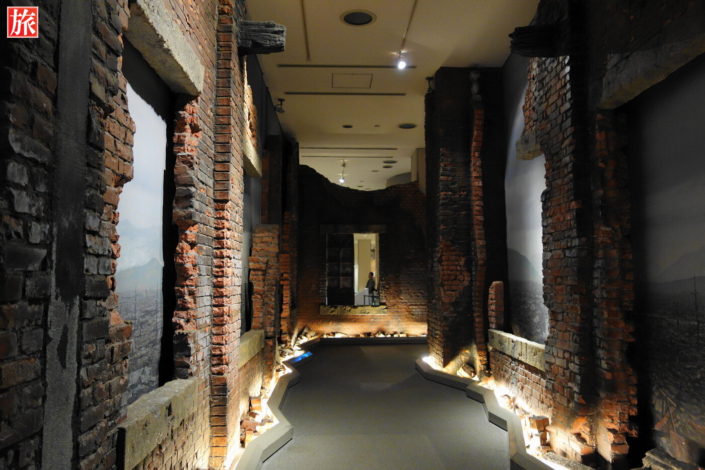 ただ一言「水をください」という文字が刻まれた柱。破壊されたレンガ通りの様子。生死の境をさまようパネル。