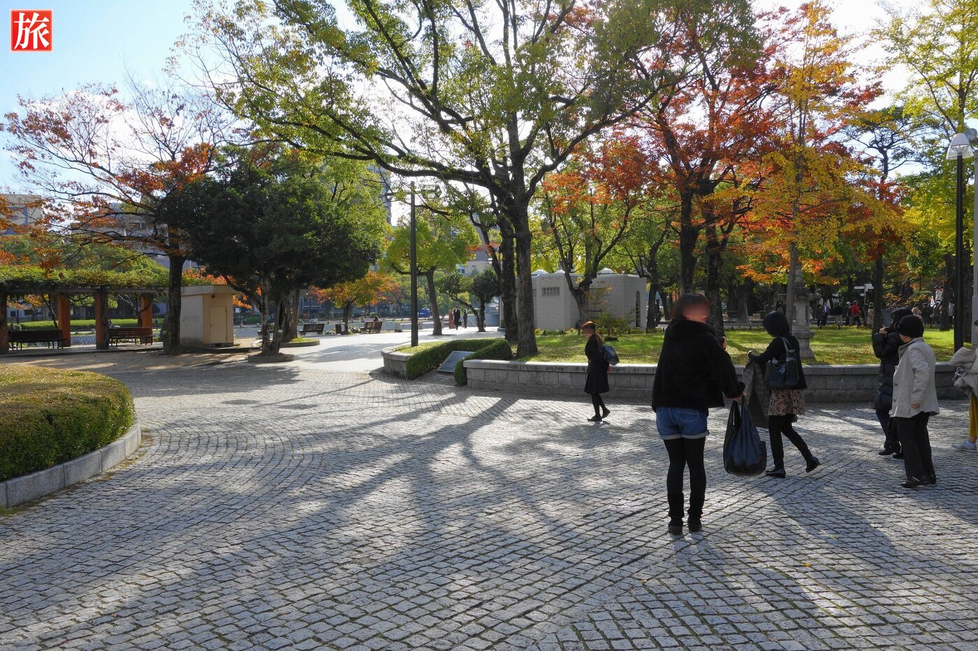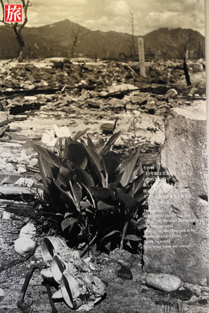 ズルズルと皮膚はむけ血みどろの瞳の中、彷徨い歩く姿。黒い雨あとが残った白壁。原爆投下後の秋に希望の植物が生えました。本館から原爆死没者慰霊碑・広島平和都市記念碑の方向眺めた様子です。