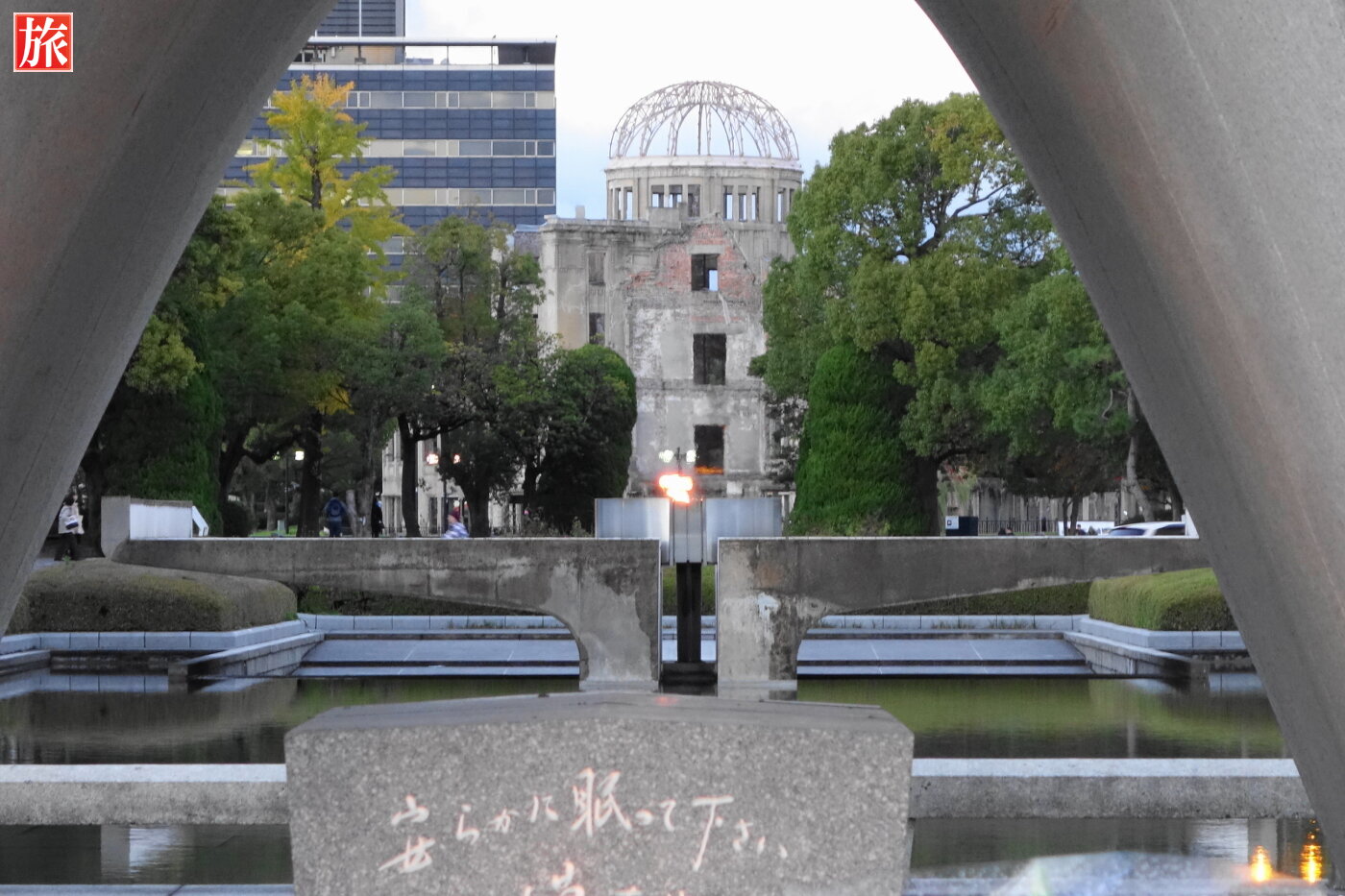 慰霊碑と原子ドーム。「安らかに眠って下さい 過ちは繰返しませぬから」と刻まれています。