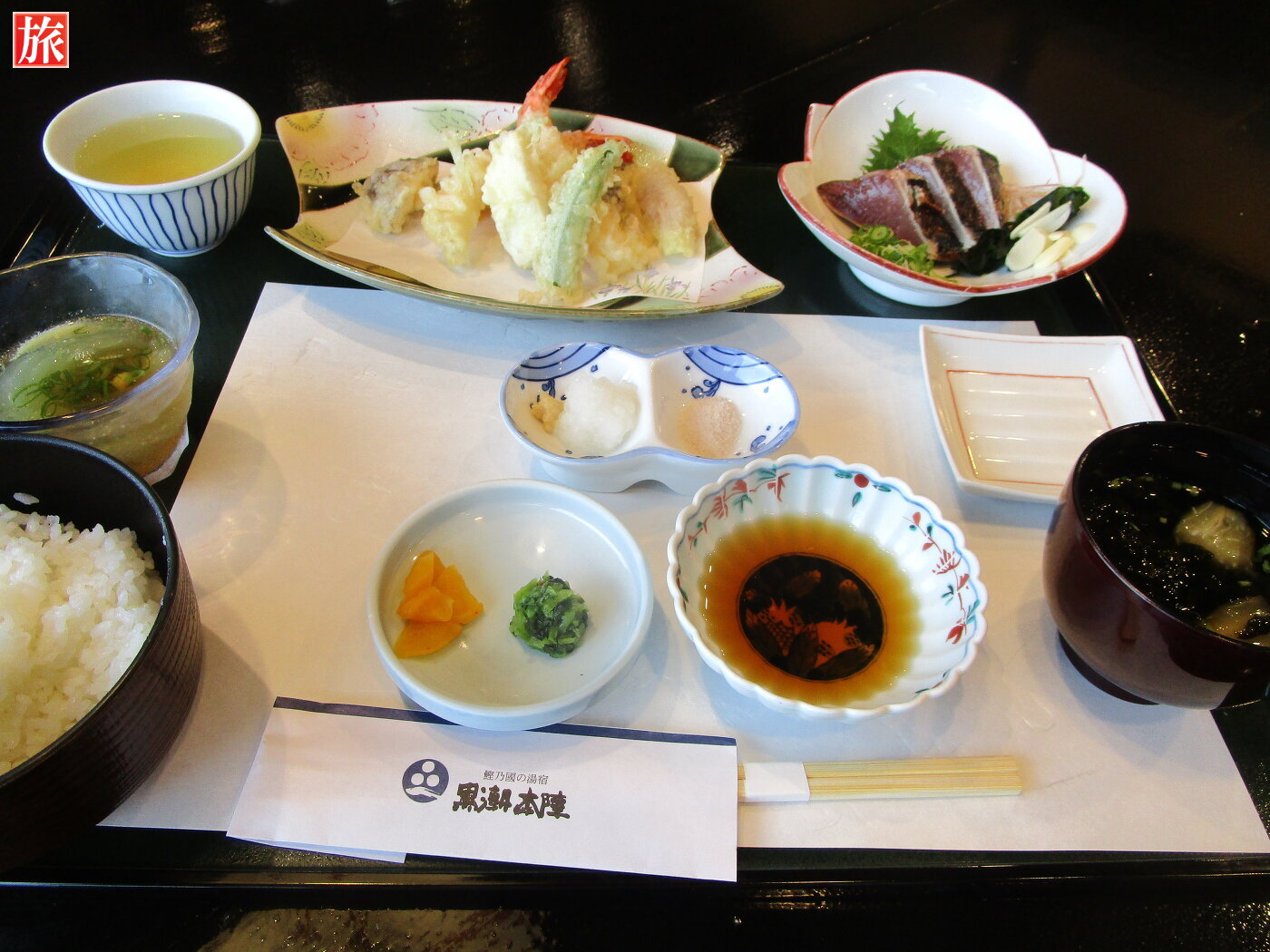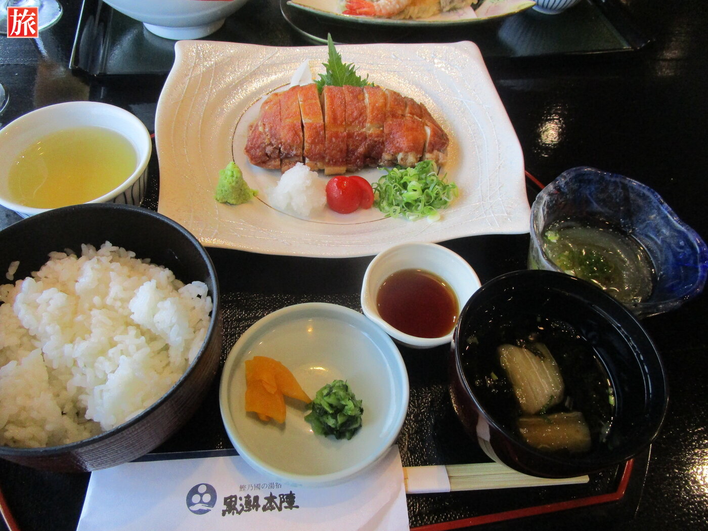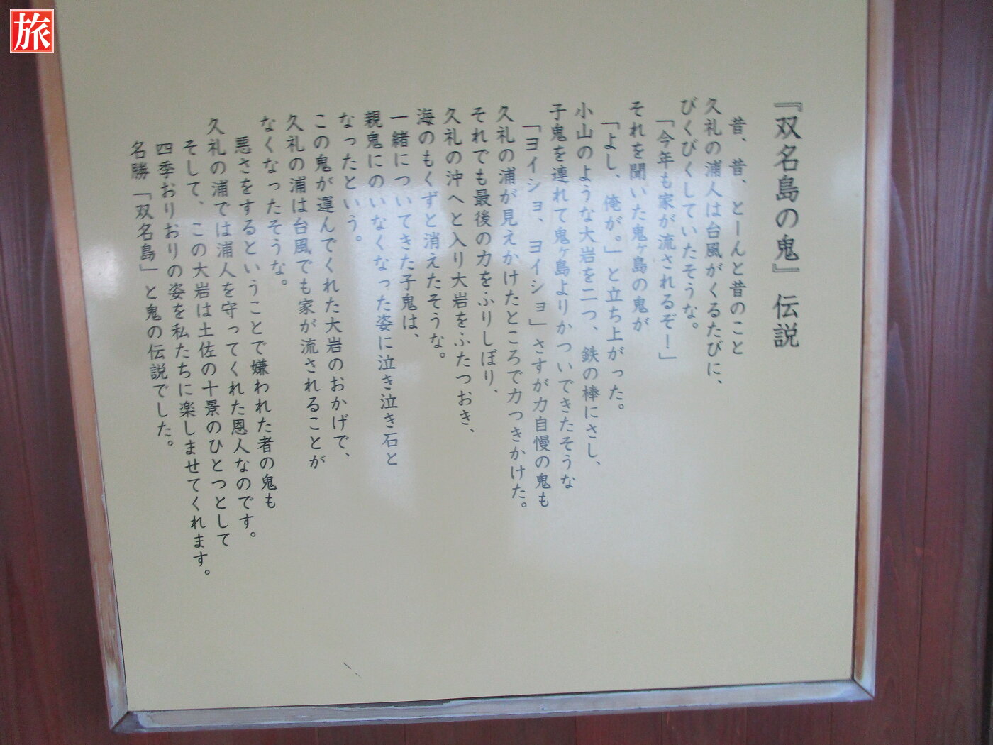 中土佐町の観光名所「双名島の鬼」の伝説。久礼湾にぽっかりと浮かぶ一対の双名島は「むかし台風や嵐で苦しめられていた久礼の人々のために心優しい鬼の親子が岩山を沖へ運んだ」という話が語り継がれています。レストラン・茶屋本陣【櫂】で昼食。天ぷらタタキ定食とトンカツ定食。