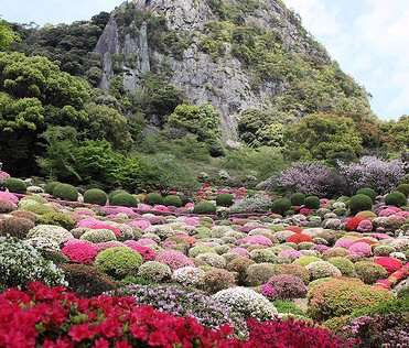 御船山の断崖を背景に四季折々の花が見られる。園内は桜5000本やツツジ20万本、樹齢170年の大フジを植栽している。