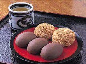 名物のお諏訪のぼた餅は、あんこ餅3個ときなこ餅2個が付いて大満足。月見うどんなどの麺類も食べられる。