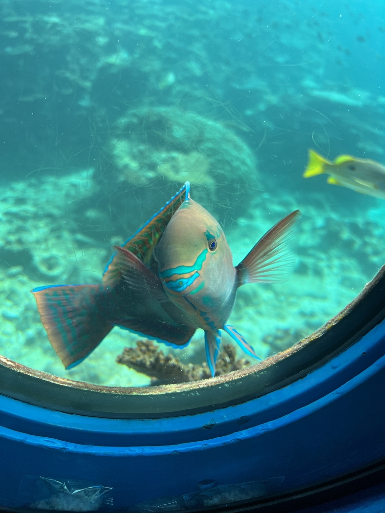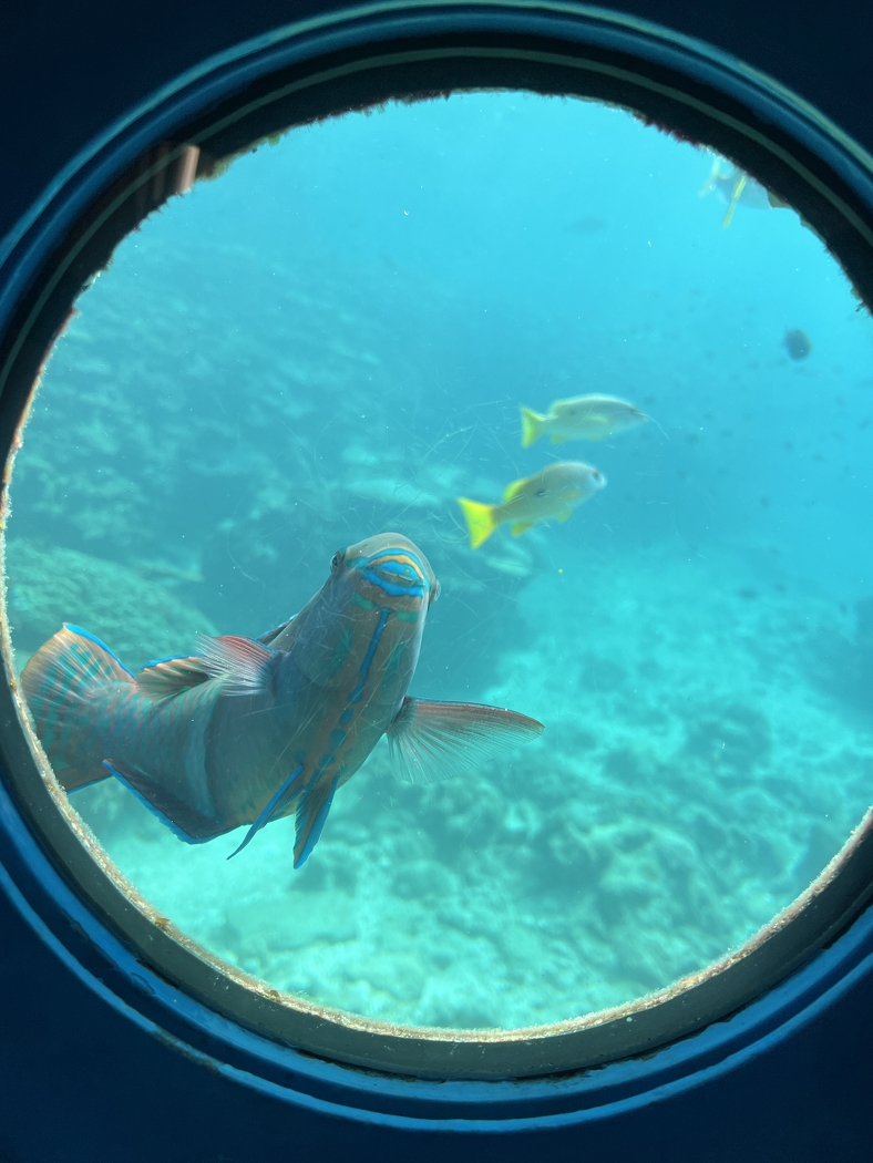 海中展望塔の底は水深約5メートルに位置し360度の眺望で、水族館とは異なり自然に海で泳ぐ姿が丸窓のガラスごしに見ることができます。