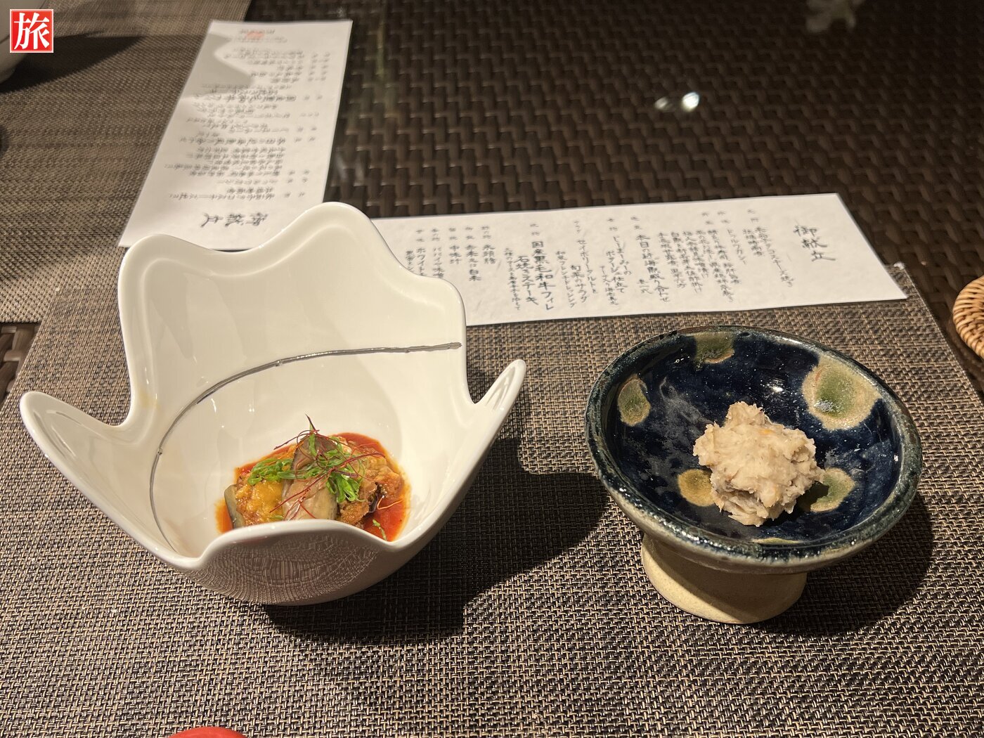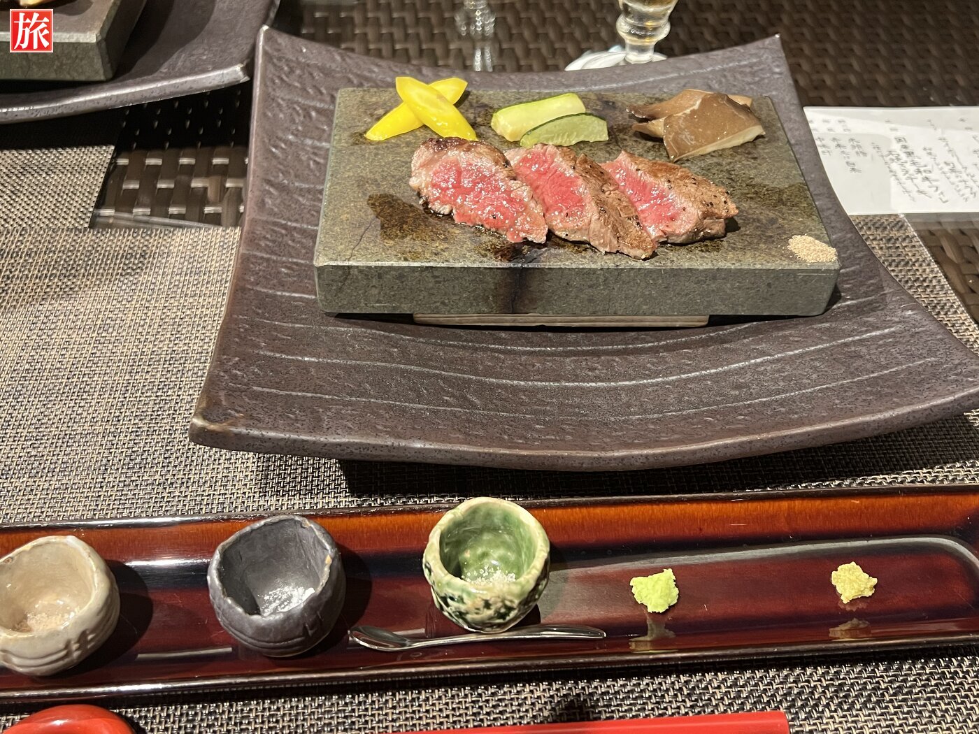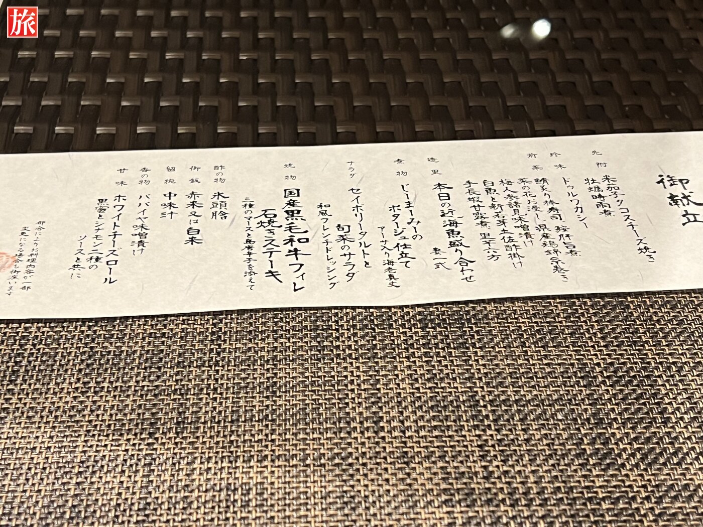 夕食 煮物(じーまーみーのポタージュ仕立て)サラダ(セイボリータルトと旬菜のサラダ)焼物(国産黒毛和牛フィレ石焼ステーキ)酢の物(氷頭膾)御飯(赤米又は白米)留椀(中味汁)香の物(パパイヤ味噌漬け)甘味(ホワイトチーズロール、黒蜜とシナモン二種ソース添え)