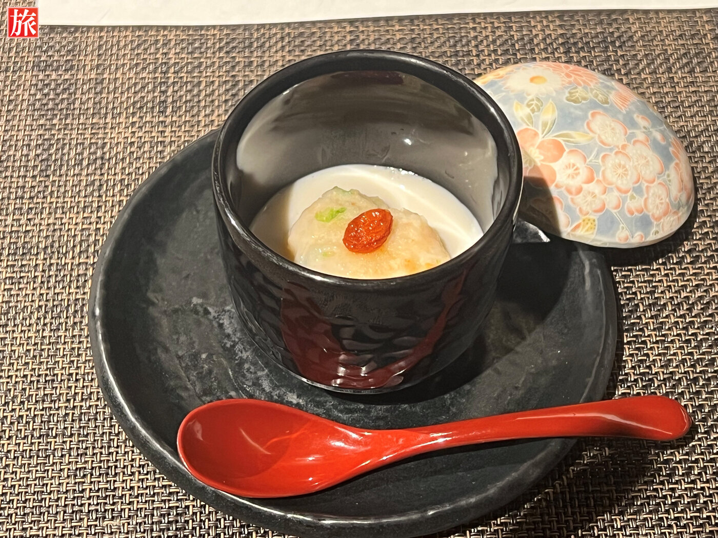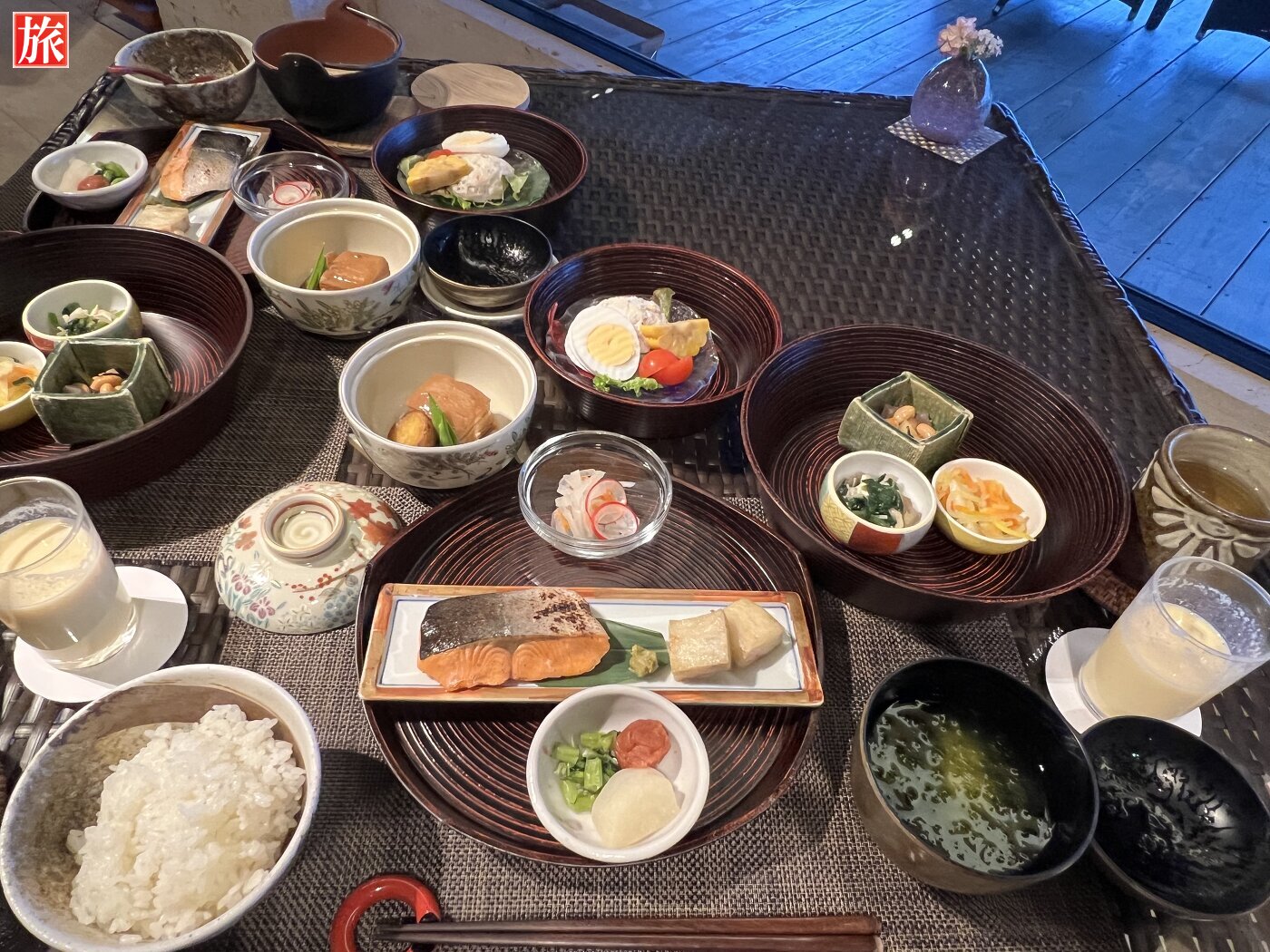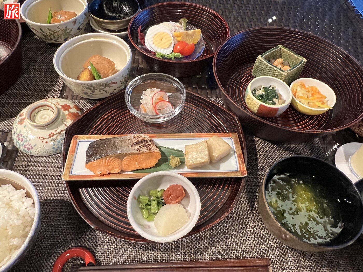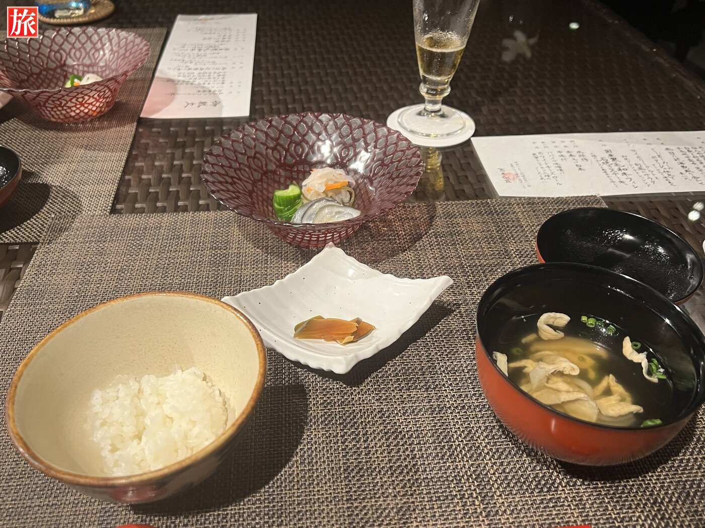 夕食 煮物(じーまーみーのポタージュ仕立て)サラダ(セイボリータルトと旬菜のサラダ)焼物(国産黒毛和牛フィレ石焼ステーキ)酢の物(氷頭膾)御飯(赤米又は白米)留椀(中味汁)香の物(パパイヤ味噌漬け)甘味(ホワイトチーズロール、黒蜜とシナモン二種ソース添え)
