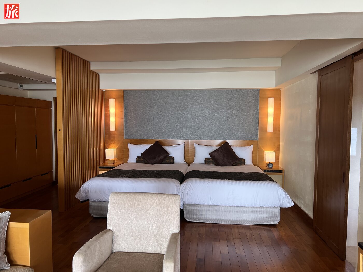 外観。ウエルカムドリンク。エグゼクティブスイート内部屋の様子。