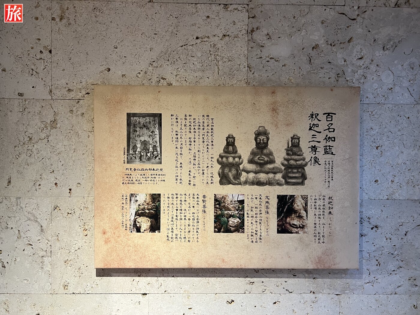 館内は、フロアを一周できる回廊を始め、巨大なガジュマルが生い茂る中庭や、高さ7メートルを超える石仏のある洞窟(ガマ)、ギャラリー、ライブラリーなど