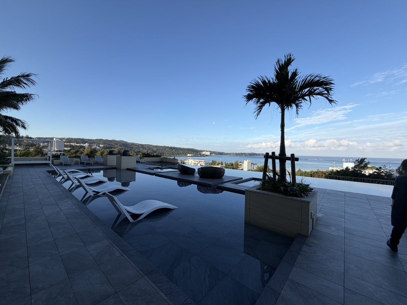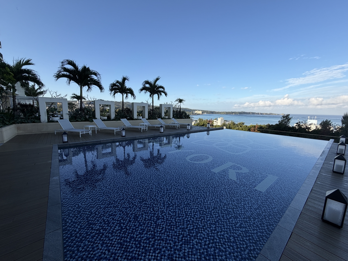 恩納村の高台に建つ「暮らせるリゾート」。全室オーシャンビューで70m²以上、リビングとフラットに繋がるテラスからはエメラルドグリーン海を一望。
