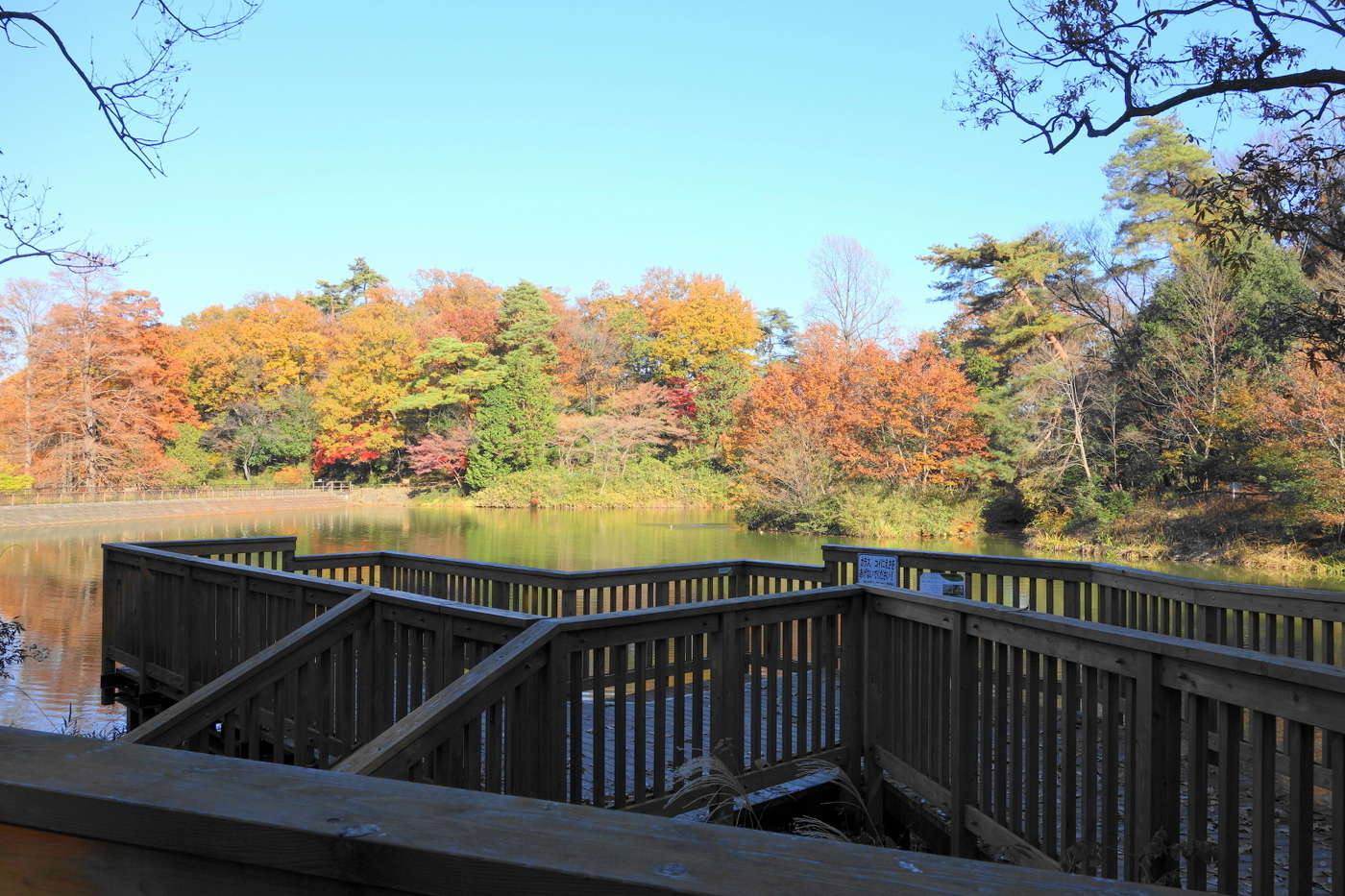 池の南側湿地にあった水車。南側から池を望む。紅葉との風景も良かった。公園南門(武蔵大和駅方向)へ抜ける道です。