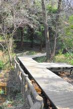 湧水の池を右手に、湧水の森の階段を上がっていきます。登りきると狭山公園駐車場(ダム南端入り口付近)