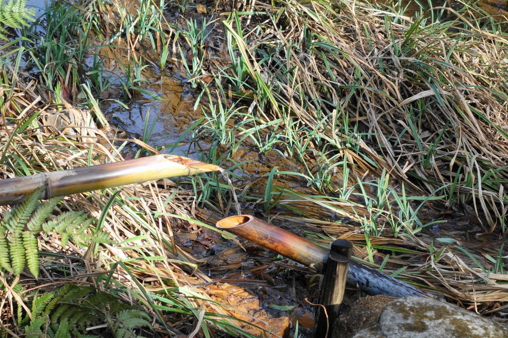 「鹿おどし」(ししおどし)たっちゃん池付近から見た公園南門方向と北側方向の道。湧水の池は緑の草に覆われていました。