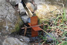 池の南側には「鹿威し」(ししおどし)と小さな水車。鹿おどしからはコンッと響きわたる音がしました。苔むした石。