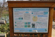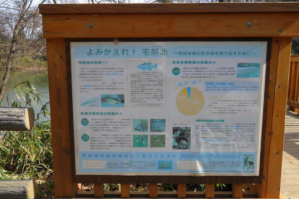 宅部池(たっちゃん池)をもっと素敵にの看板。よみがえれ宅部池の看板。ウッドデッキが整備されています。