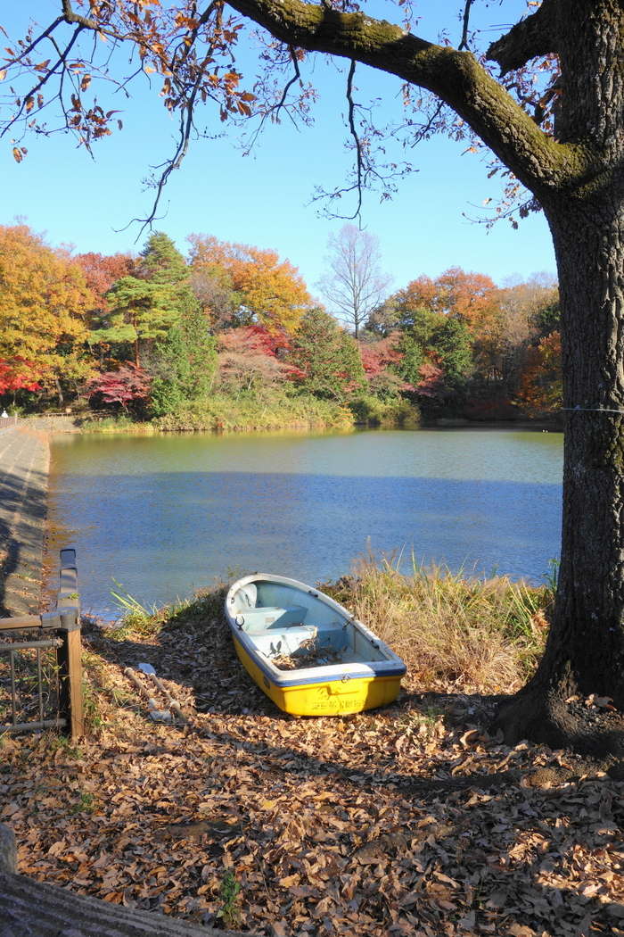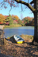 紅葉と宅部池(たっちゃん池)の風景です。 手漕ぎボートがいい雰囲気を醸し出してます。北側にある通路。
