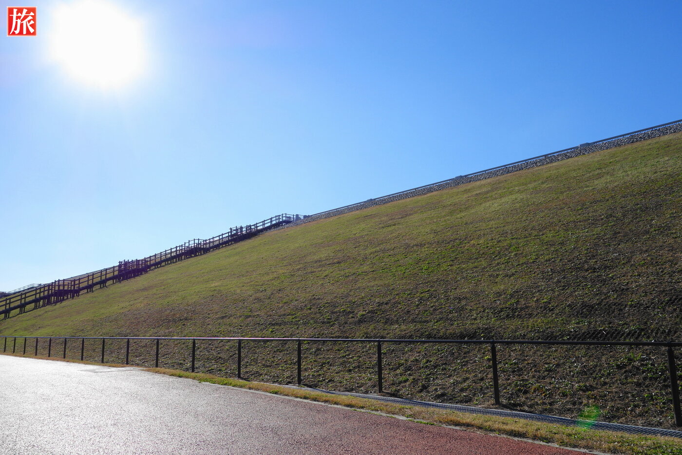 南方向を眺めた風景。堤防を見上げた様子。青い空と堤防。