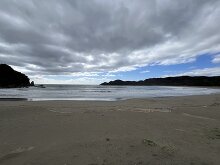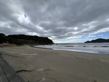 青野川の河口から北へと、見事に弓のように湾曲する砂浜が長さ1.2kmにわたって続く。湾の両側に岬があるため遠浅で波も穏やか。砂浜の背後には砂と風よけの松林が続く美しい浜辺。