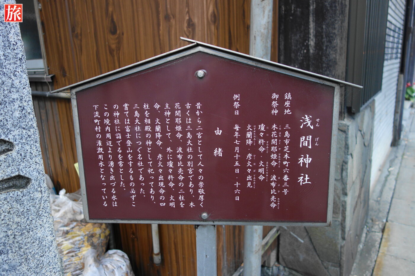浅間神社の説明板。「昔から二宮として人々の崇敬厚く 古くは三島大社の別宮であり、木 花開耶姫命、波布比売命の二柱を 主神として、外に瓊々杵命、火明命、 火蘭降命・彦火々出見命の四 柱を相殿の神として祀ってあり、 三島大社につぐ名社であった。嘗ては富士登山をするもの必ずこ の神社に詣でるを常とした。この境内周辺より湧き出づる水は 下流町村の灌漑用水となっている」