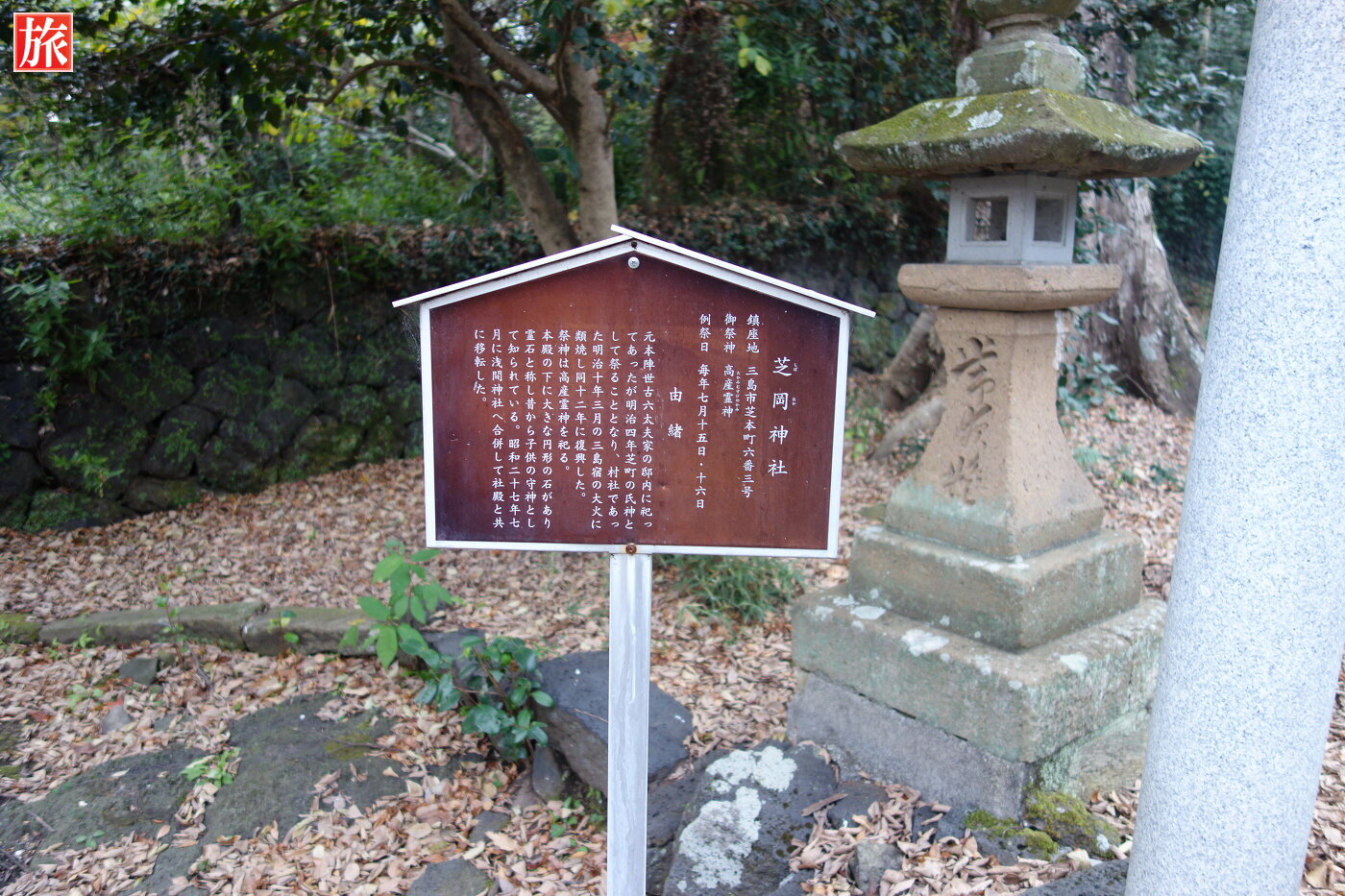 境内にある芝岡神社の説明板。「元本陣世古六太夫家の邸内に祀っ てあったが明治四年芝町の氏神と して祭ることとなり、村社であっ た明治十年三月の三島宿の大化に 類焼し同十二年に復興した。祭神は高産霊神を祀る。本殿の下に大きな円形の石があり 霊石と称し昔から子供の守神とし て知られている。昭和二十七年七 月に浅間神社へ合祀して社殿と共 に移転した。」