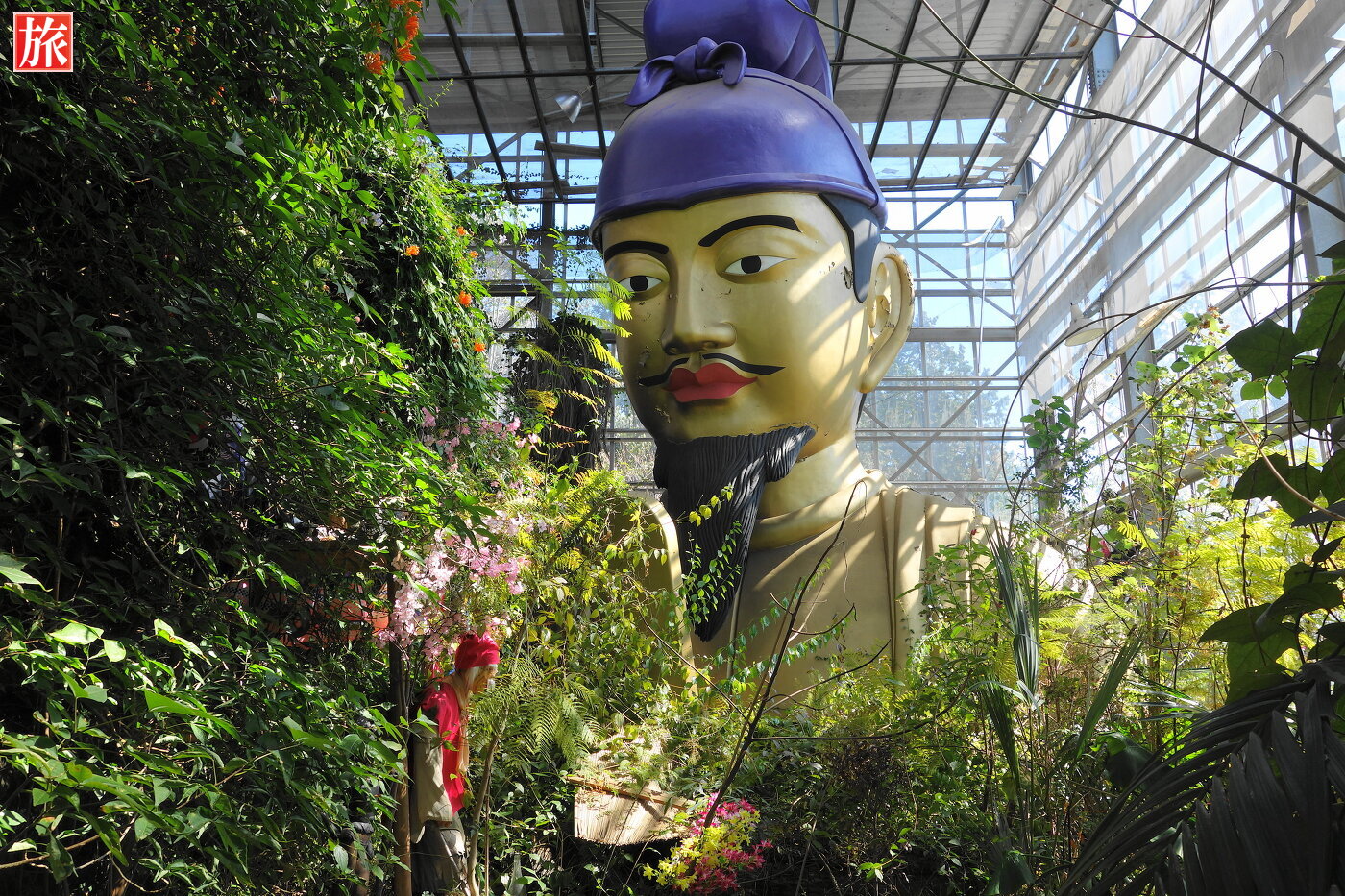 大仏堂入口。閉園した植物園の名残でしょうか?空調の利いたガラスの室内に植物が茂っています。オルメカ文明の巨石人頭像。