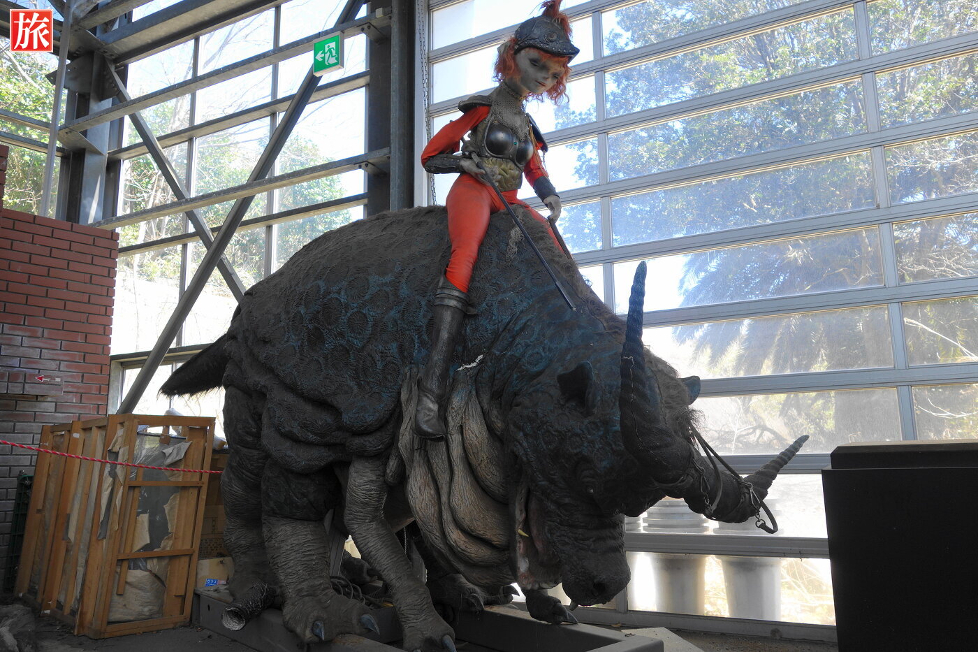 得体のしれない動物(サイの化け物)に乗った?モアイ像が巨大聖徳太子像を眺めています。
