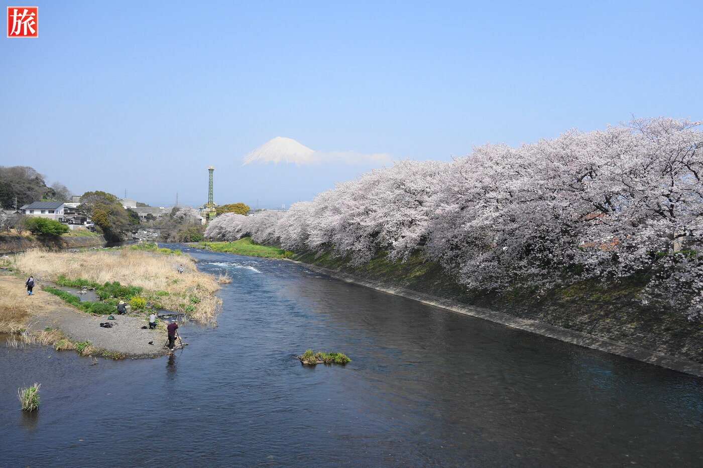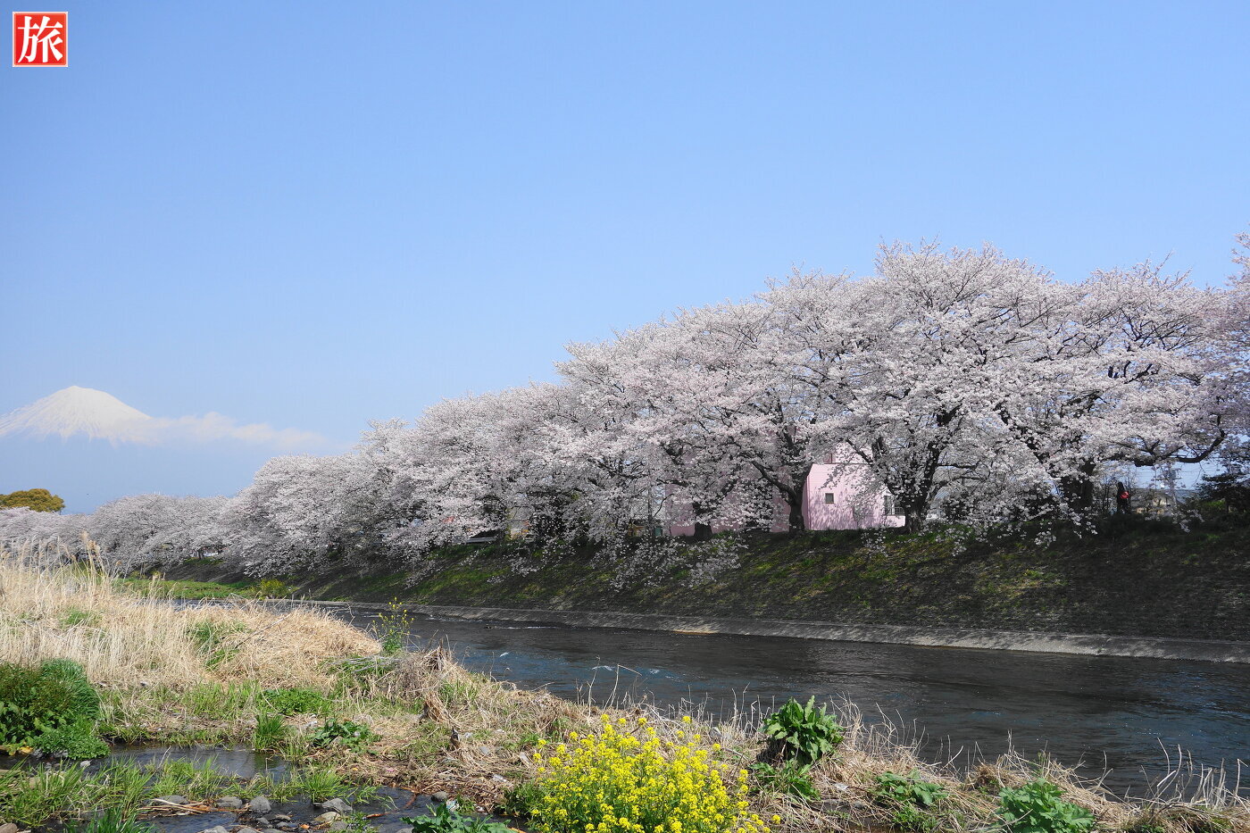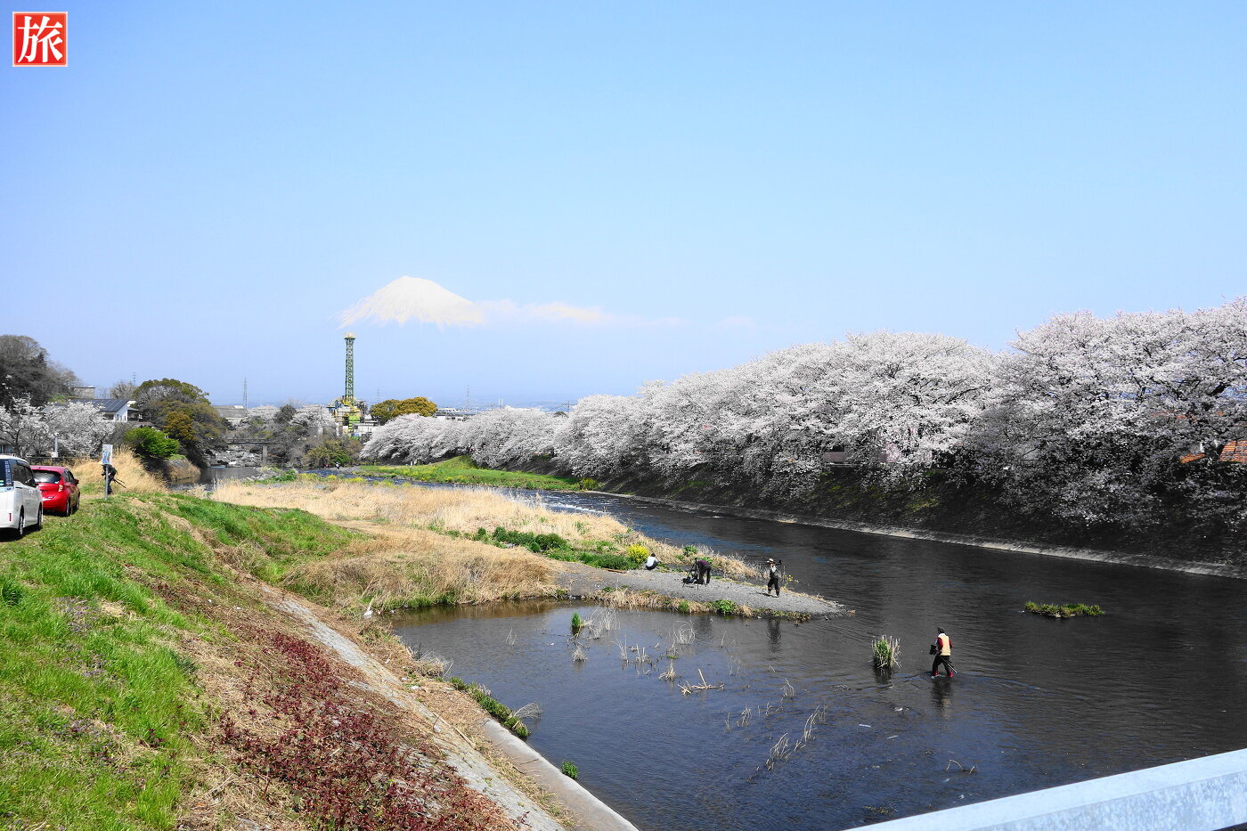 知る人ぞ知る、桜と富士山の写真スポット。駐車スペースは土手沿いに数台程度。