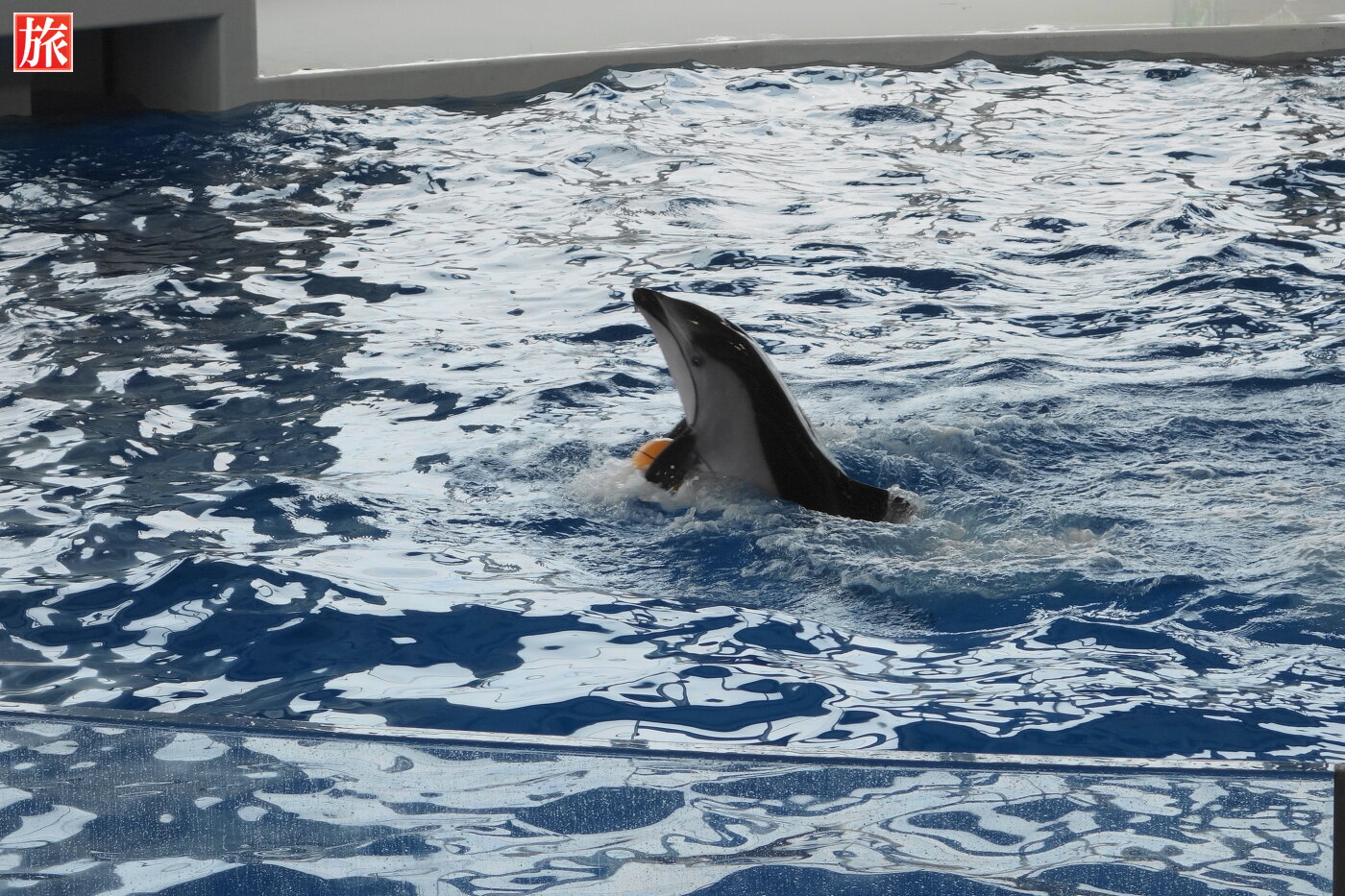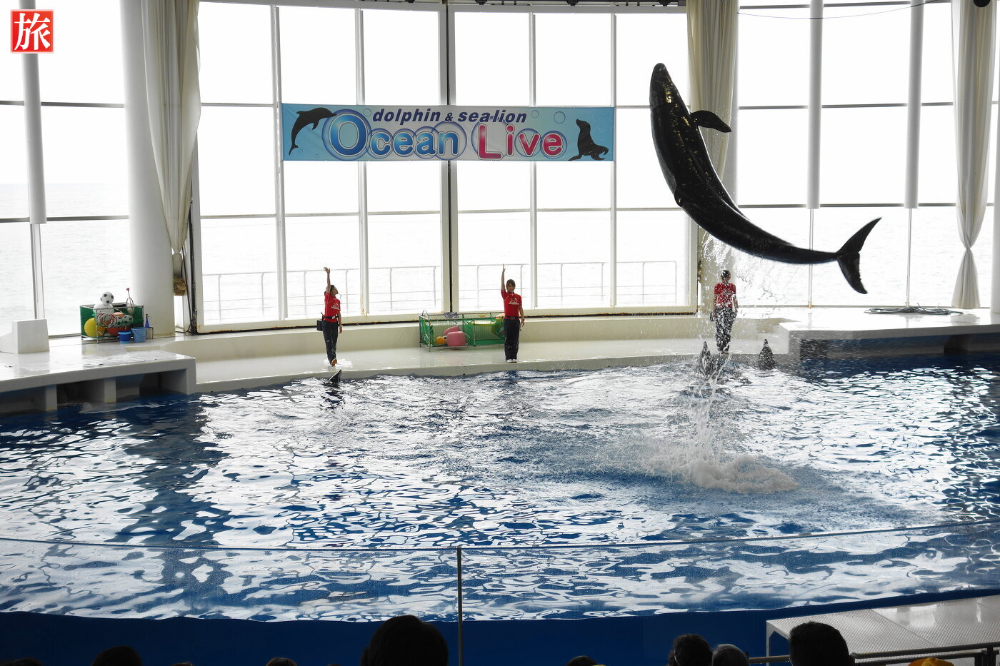 イルカが空中を乱舞するオーシャンライブ、水槽に潜ったダイバーが水中カメラで魚の表情を映し出してくれるアクアウォッチングなど、ショープログラムも充実。一日たっぷり楽しめる。アクアホールの水槽内を優雅に泳ぐイルカも見られる。