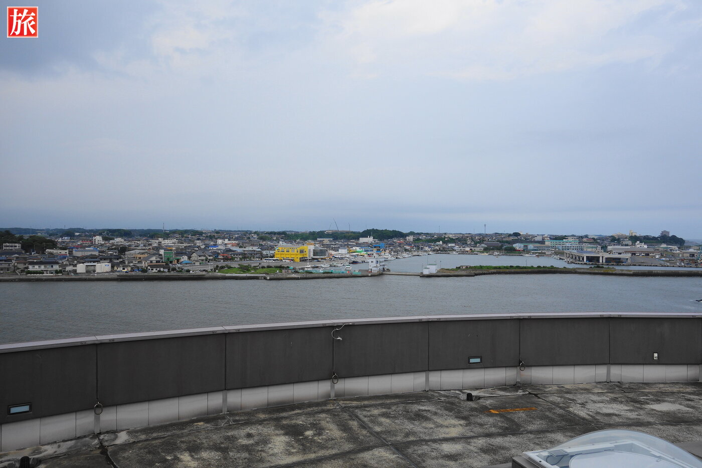 7Fの展望ホールです。外へ出て那珂湊を眺めた風景。水族館最大規模のキッズコーナー。生き物とふれあうことのできる「タッチングプール」があります。
