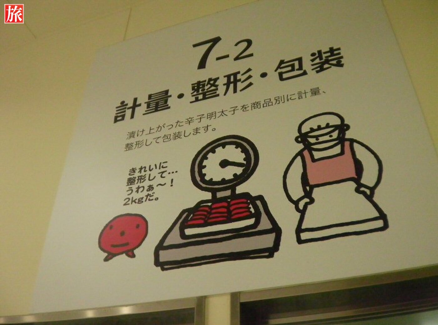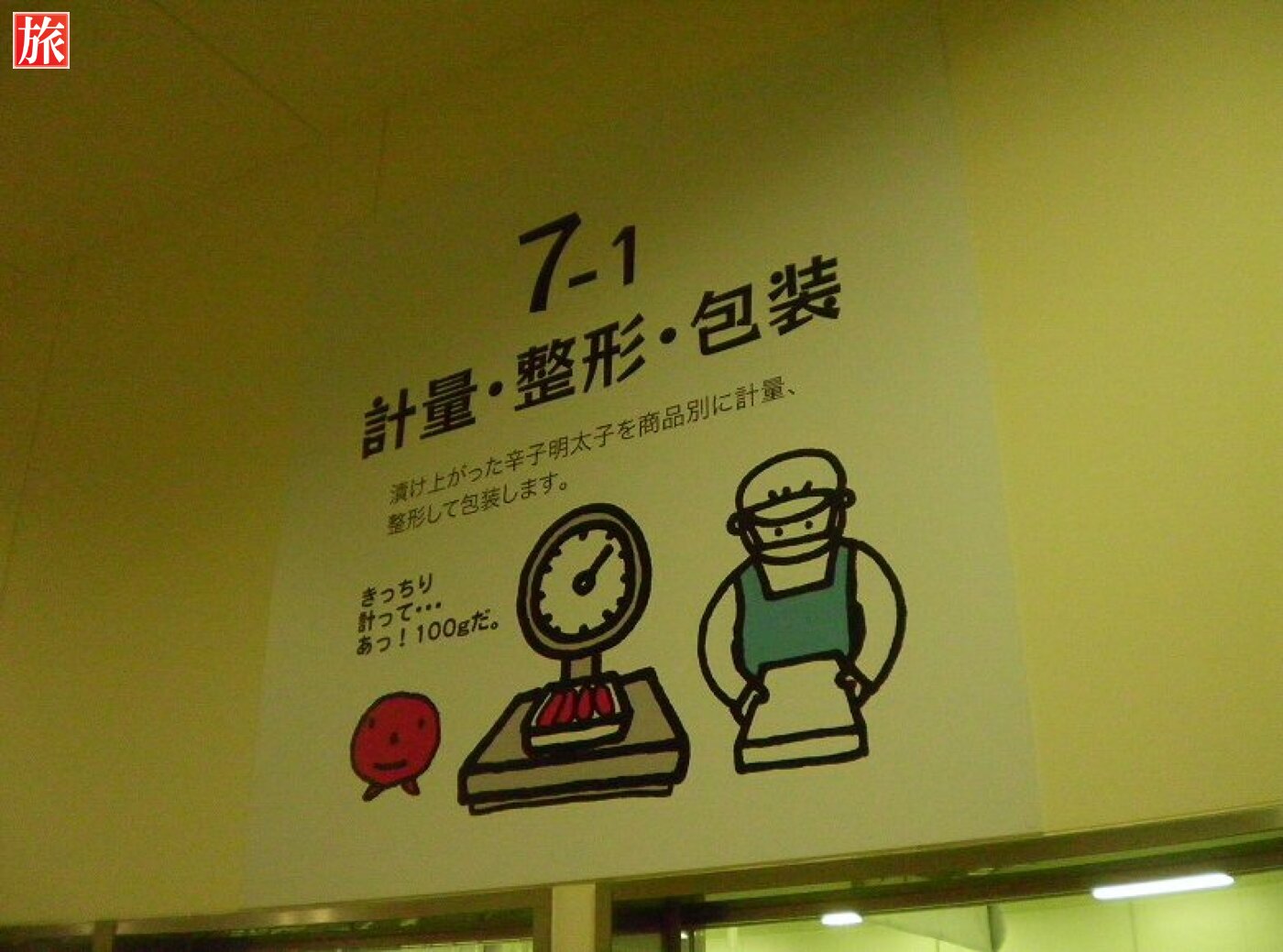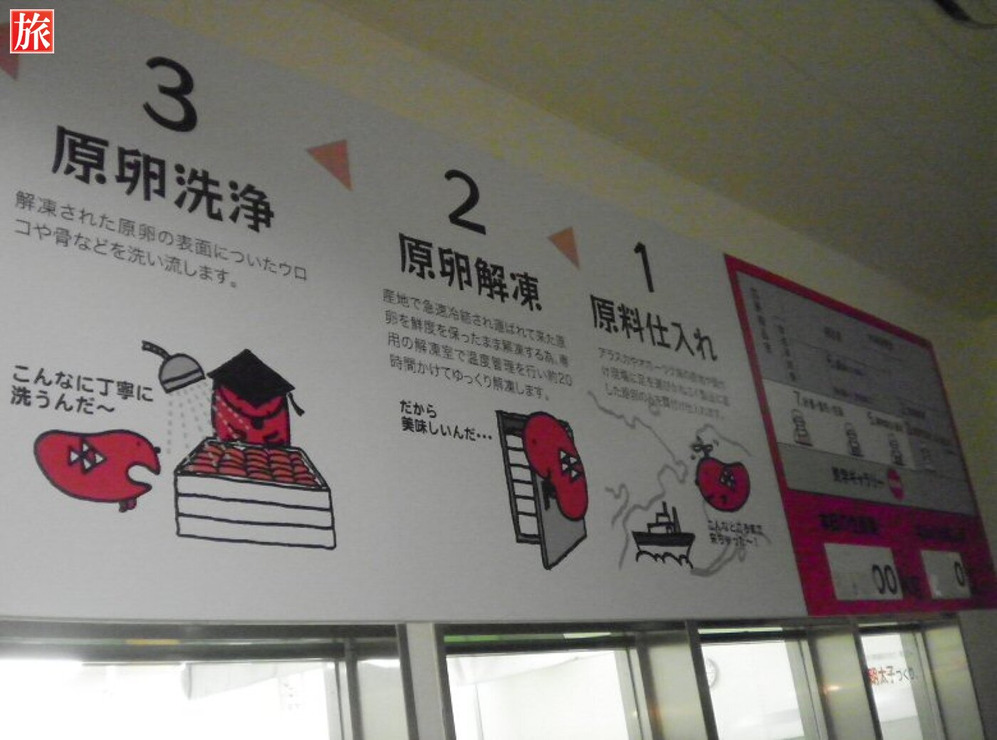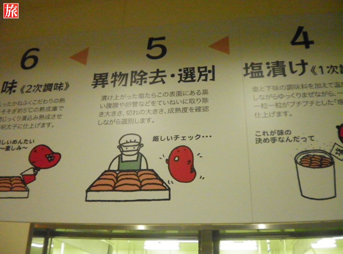 工場見学は無料でした。入って直ぐは薄暗く、スケソウダラの生態、成長の様子や画像映像で楽しめます。めんたいこが出来るまでの具体的な工程の説明です。
