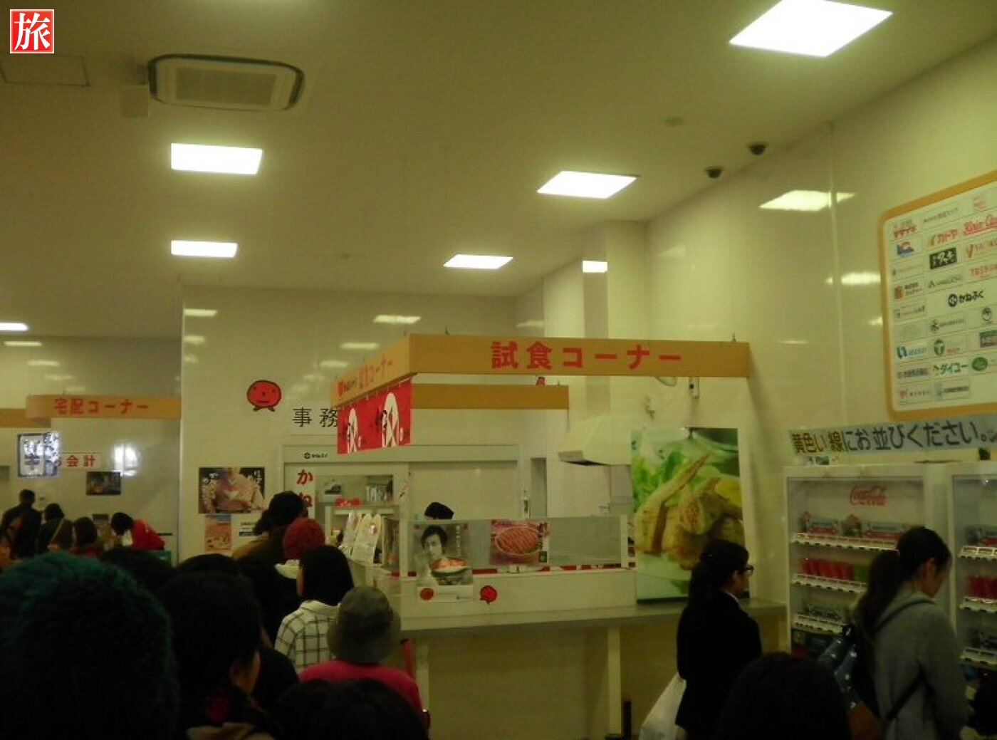 試食コーナーでは、一口大のめんたいこと、軍艦巻きを味わえます。無料の自販機ドリンクコーナーもありました。
