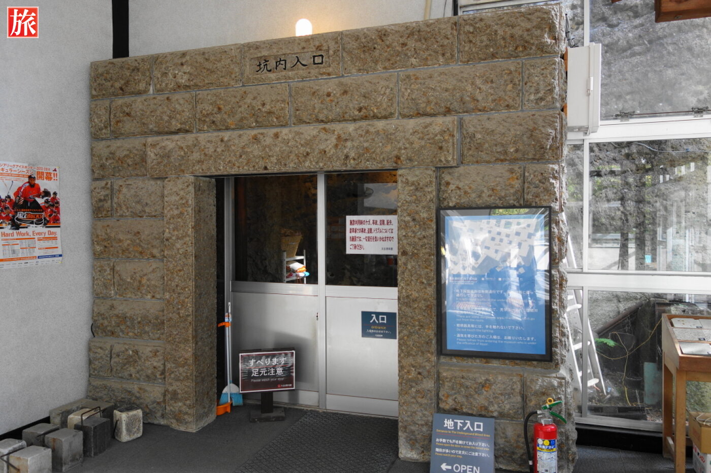 入口付近には毛布の貸し出しをしていました。坑内は年間平均気温7度。最高気温でも13度前後とのことです。受付カウンター後ろのにある資料展示室入口です。