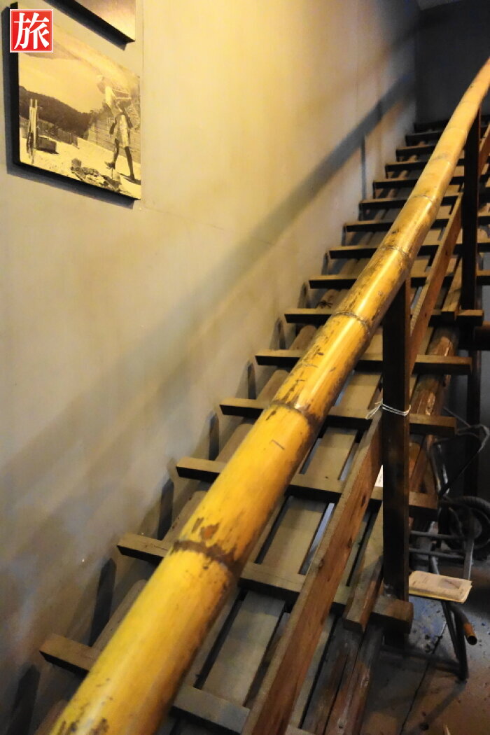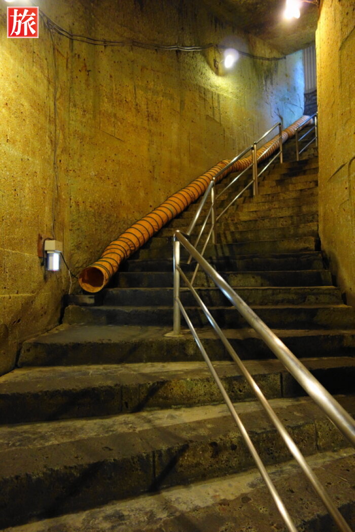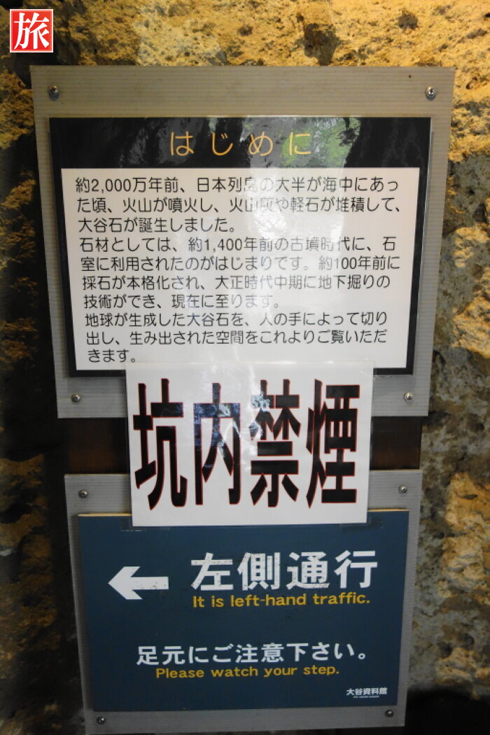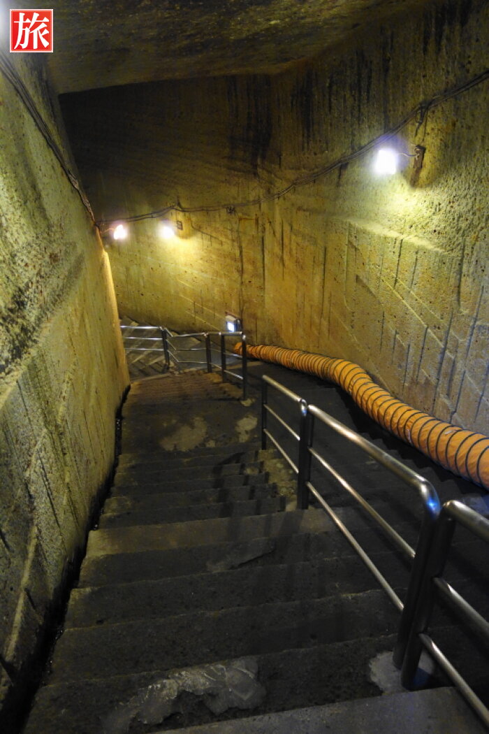 坑内禁煙と左側通行の看板。坑内に降りる階段の様子。