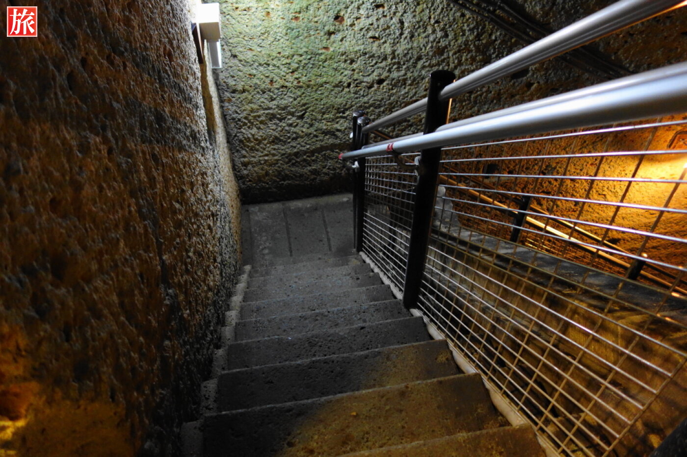 入口付近の階段。出口付近にゼオライトの説明板がありました。下方向を見た様子です。