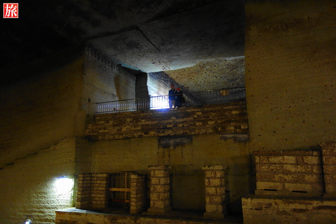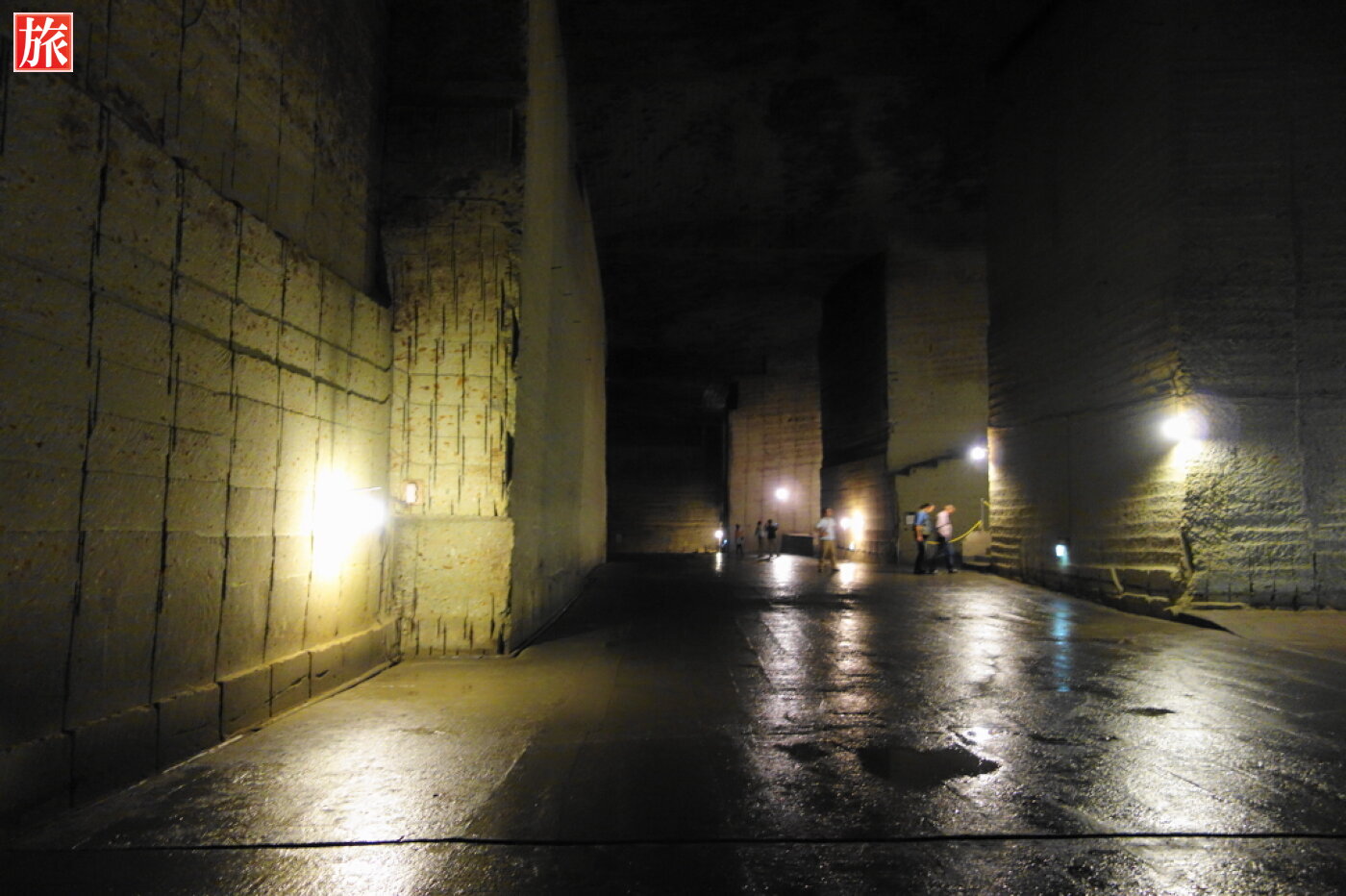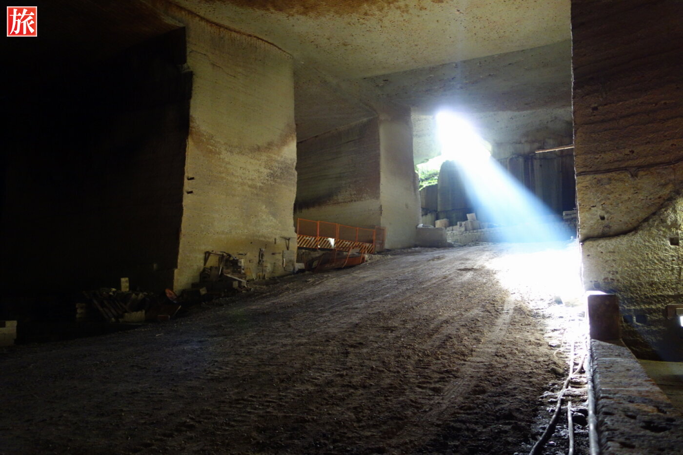 地下中央部から降りてきた所を眺めた様子。巨大な地下空間です。あちらこちらに、採石跡があります。