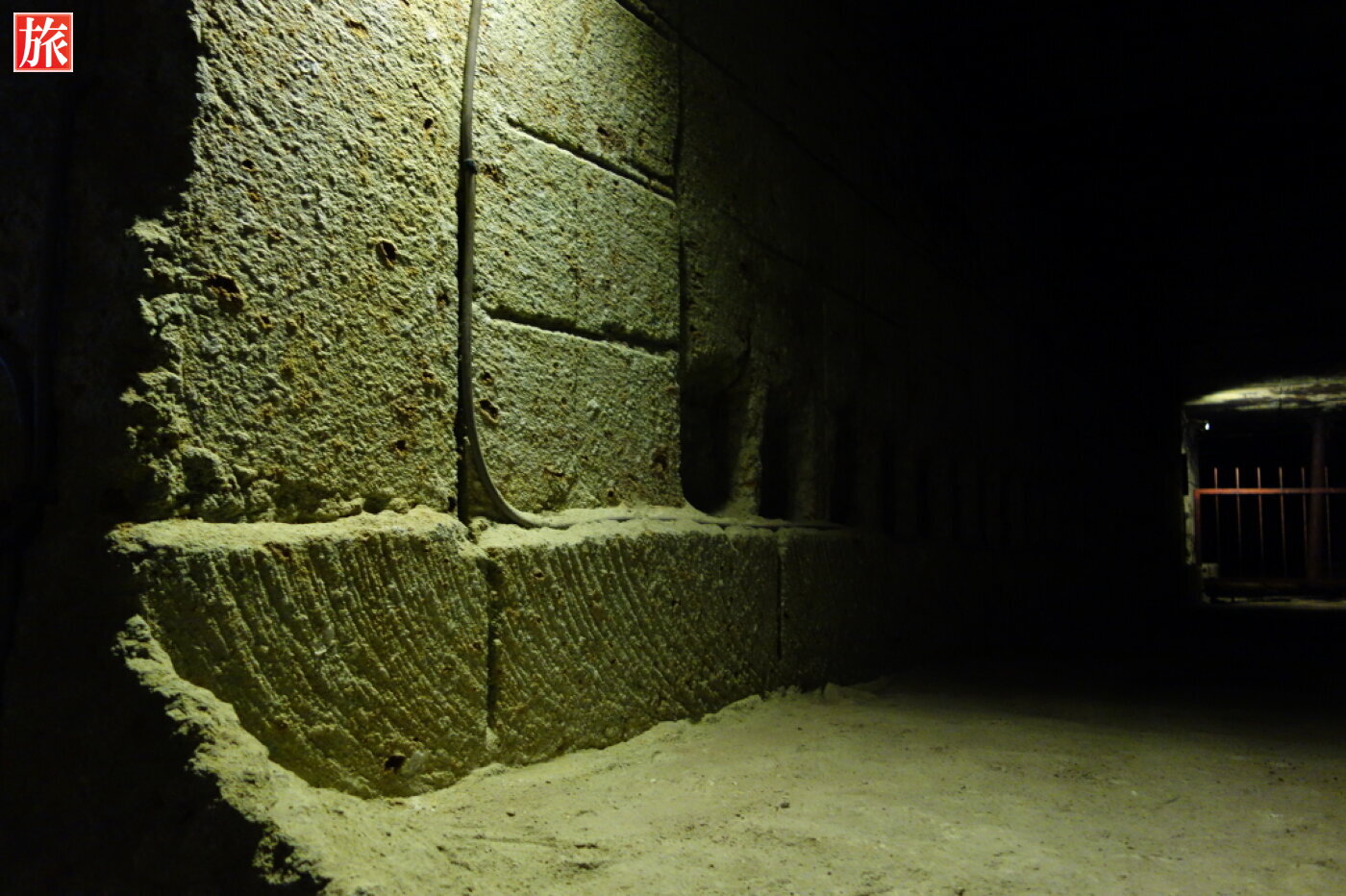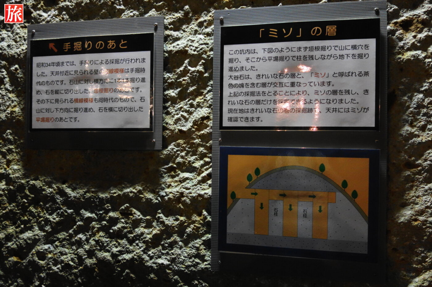 地下中央部の様子です。コンサートでも使用される舞台の壁面の様子です。壁面に残る、機械堀あと。機械堀あとの看板・採石本数の看板。