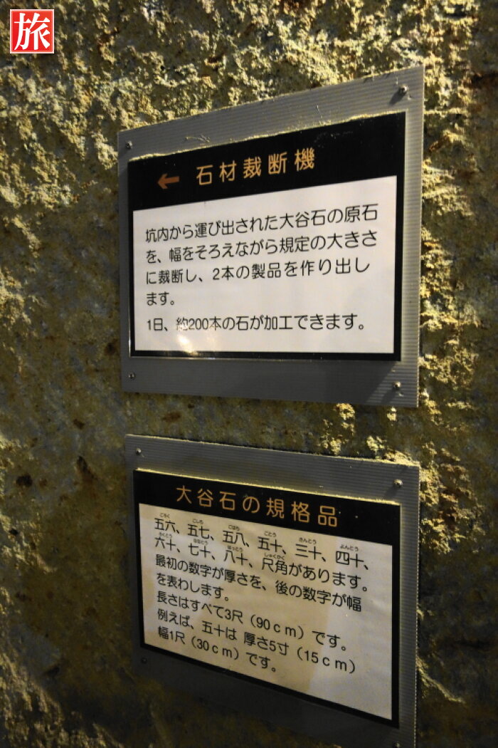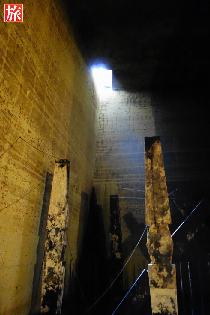 天窓が見える場所から通路へ向かい下方向を眺めた様子です。石材断裁機です。石材断裁機の説明板。坑内の入口近くから天窓を望む。