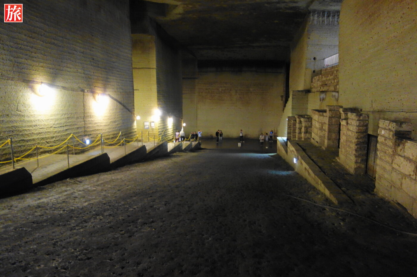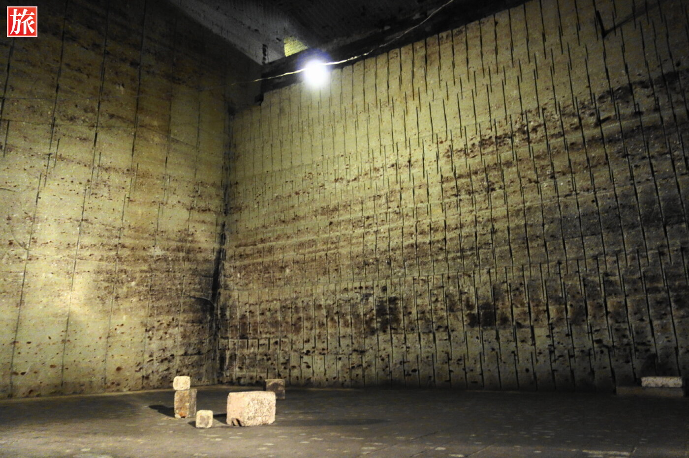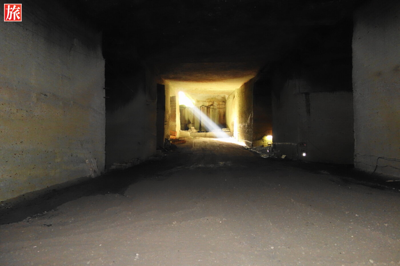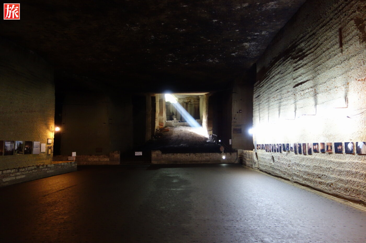 さらに階段を下ります。壁面には地下軍事工場の説明書きがありました。大谷資料館地下は、地下航空機工場群のひとつで、城山機体工場の金入山作業所と呼ばれ、工作機械・熱処理部門の工場になっていました。説明書の内容は「この地下空間は戦時中、陸軍の地下倉庫として、また、中島飛行機の戦闘機「疾風」の機体工場として利用されました。当時、他の地下工場や外につながるたくさんのずい道(トンネル)が掘られ現在もこの奥に残っています」と記されています。説明書きがある付近から右方向を望む。