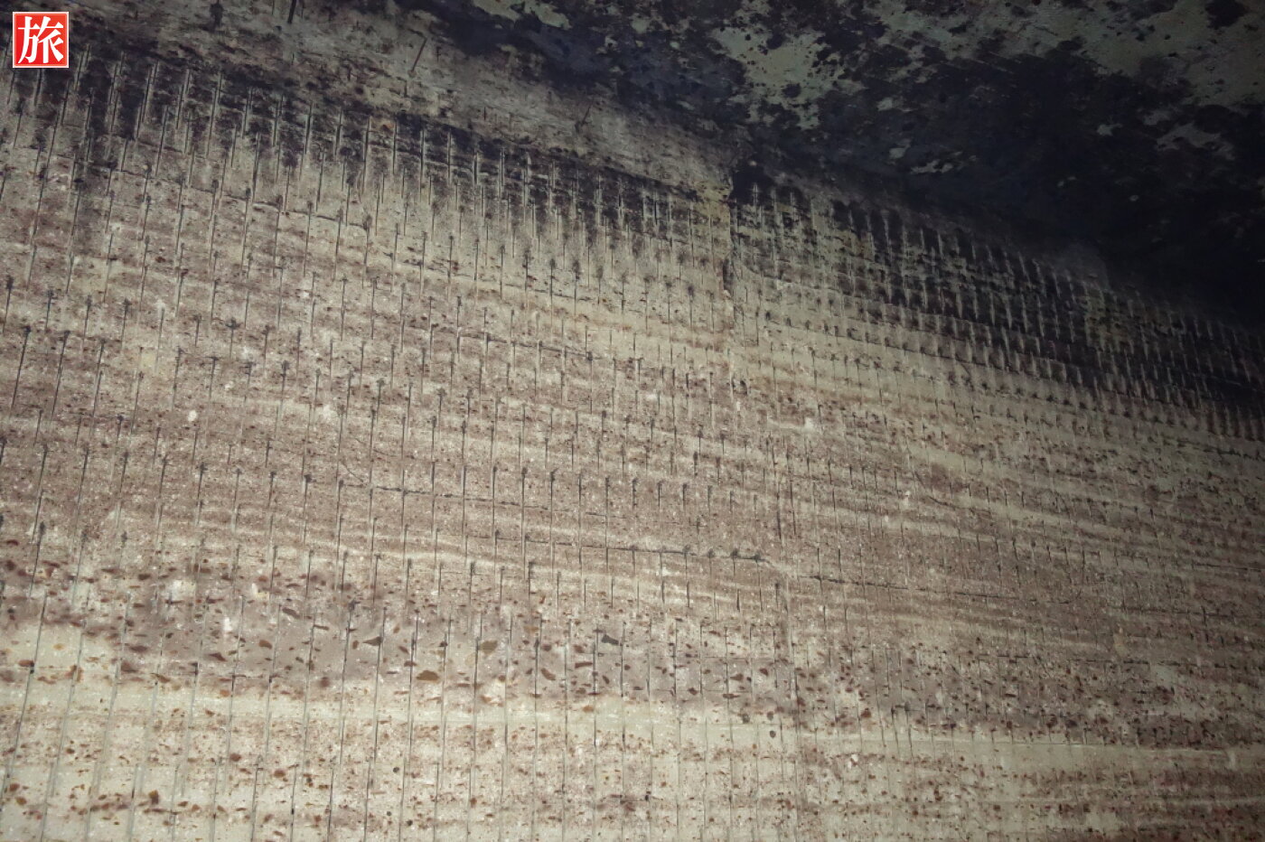 階段を登り復路となります。途中から下を見下ろした眺めです。復路途中の右側方向に地下水が溜まったと見られる場所がありました。付近の壁。