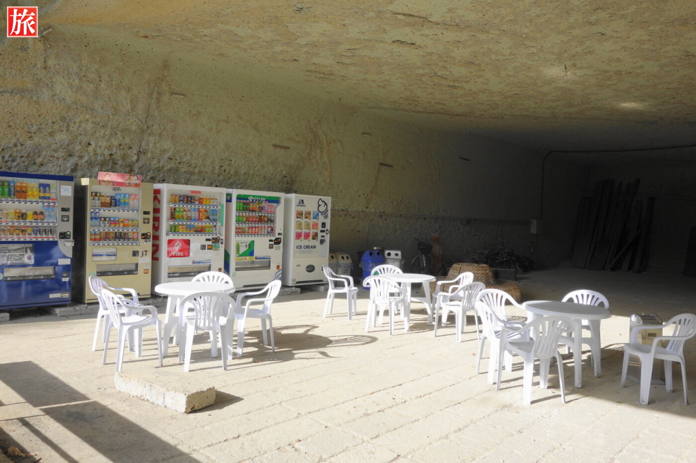 大谷景観公園から姿川に架かる橋を渡ると大谷資料館・看板があります。駐車場の様子です。駐車場付近に、ふれあい広場があります。ふれあい広場には自動販売機とテーブルがあります。