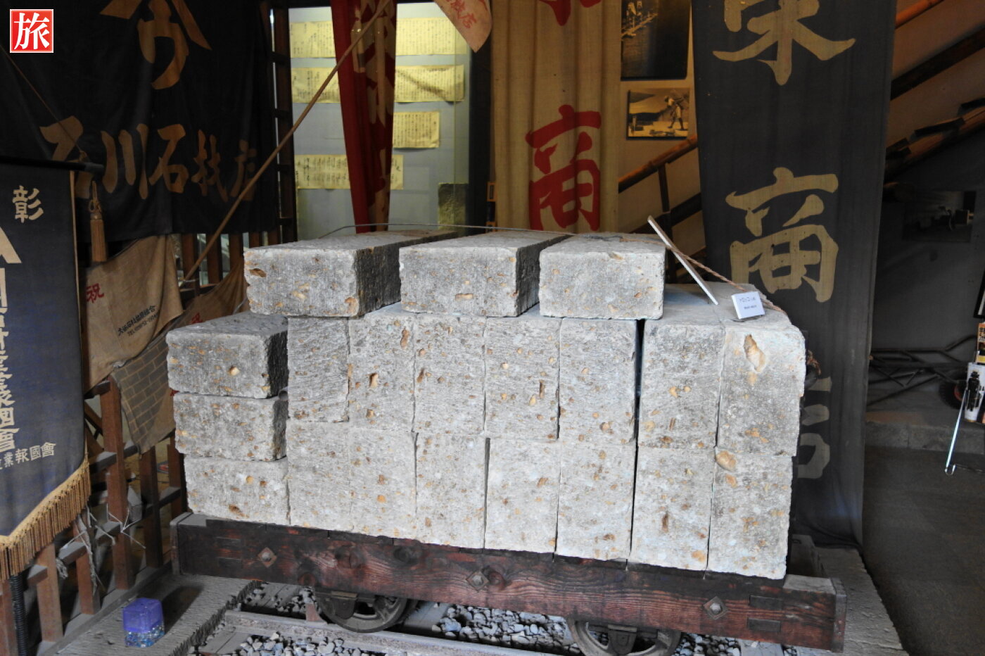運搬用トロッコ。大谷石の採石場関連の資料が展示されています。