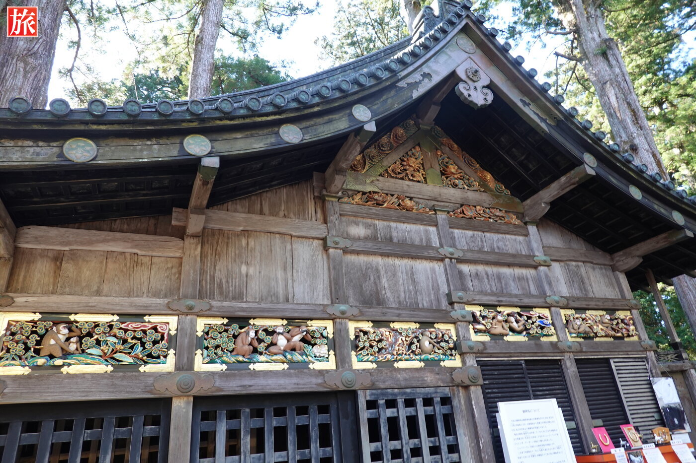 神厩舎には猿の彫刻を施した8枚の浮彫画面があります。「見ざる、言わざる、聞かざる」で有名な三猿は、この神厩舎に造られたものの1枚から伝えられます。8枚で猿の一生が描かれ、猿が馬を守る動物であるという伝承から神厩舎に刻まれているようです。