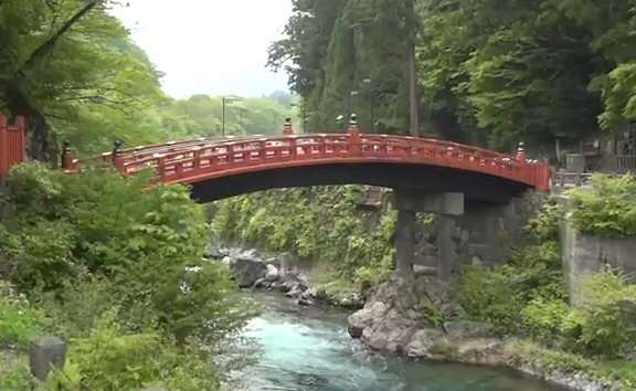 日本の三奇橋のひとつに数えられ、日光観光のシンボル的存在。橋の起源は神護3年(767)に日光開山の祖、勝道上人が弟子とともに急流を前にした時に、「深沙大王」が現われ、青と赤の2匹の大蛇を放すと絡み合って橋となり、蛇のうろこに山菅が生え、渡りやすくなったということから「山菅の蛇橋」とか「御橋」とも呼ばれています。大谷川に架かる鮮やかな朱塗りのアーチ形の橋は、くっきりと緑に映えて美しい。