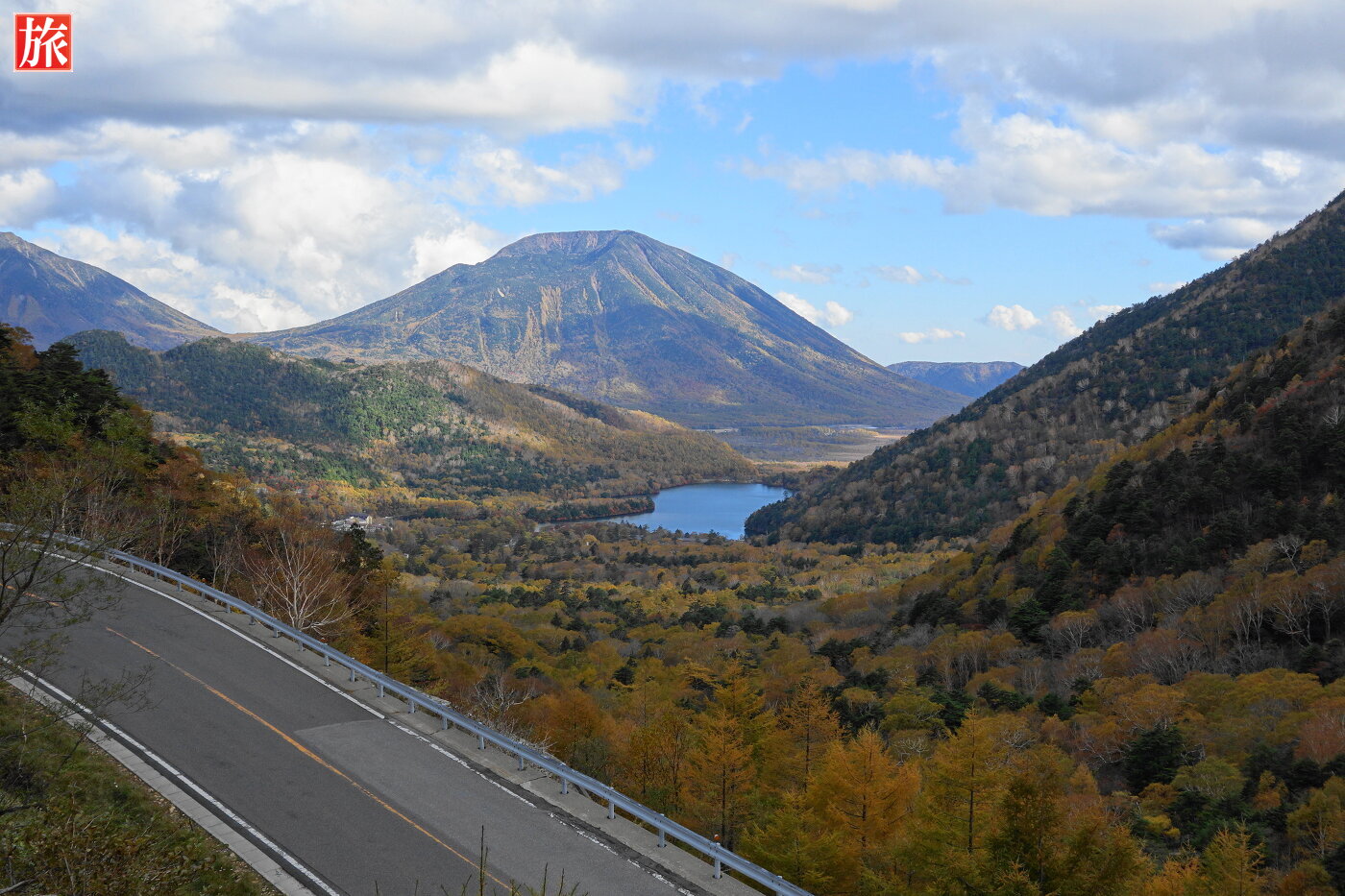 日本ロマンチック街道から湯ノ湖と男体山を望む。湯ノ湖北側入口付近から見た風景。紅葉が綺麗!