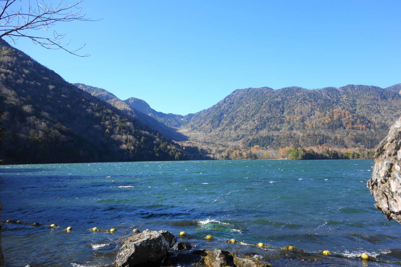 湯の湖は試験用研究水面とのことです。南(湯滝)方向の風景。紅葉が見頃を迎えていました。