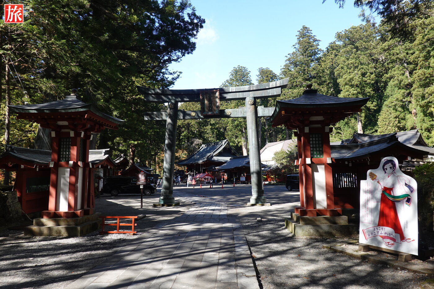 唐銅鳥居。手前にアニメ風の日光の巫女「八乙女さん」が・・・本社境内の様子。